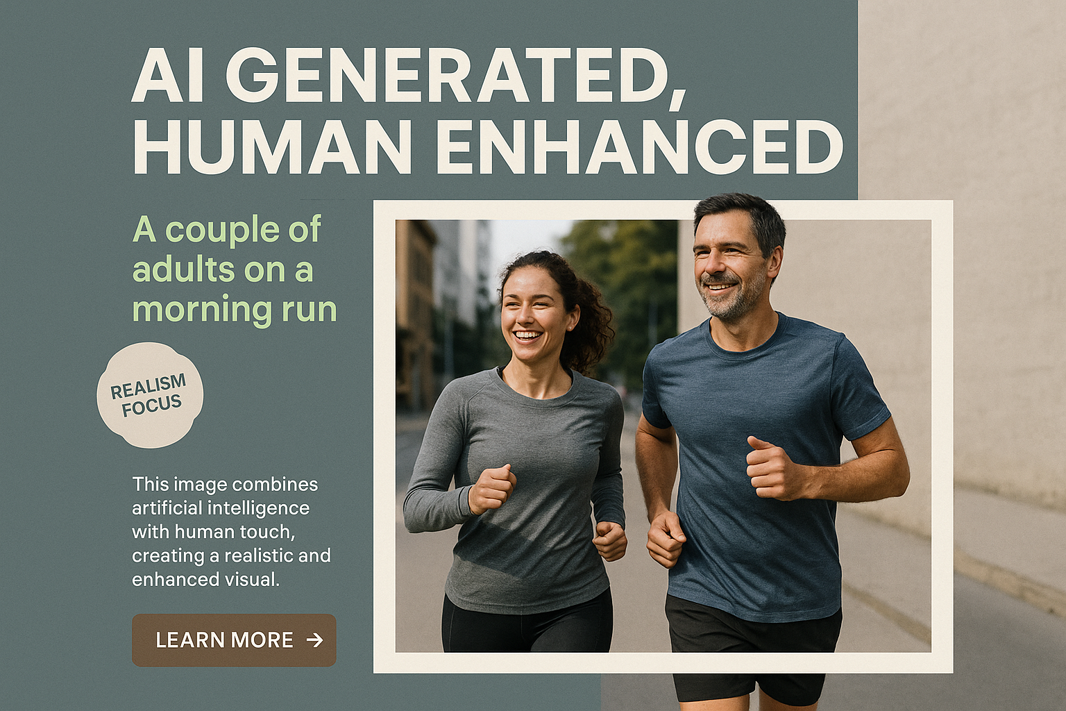 A visually engaging image showcasing a couple jogging during a morning run, highlighting a blend of AI generation and human enhancement. The background features a balanced, realistic urban setting.