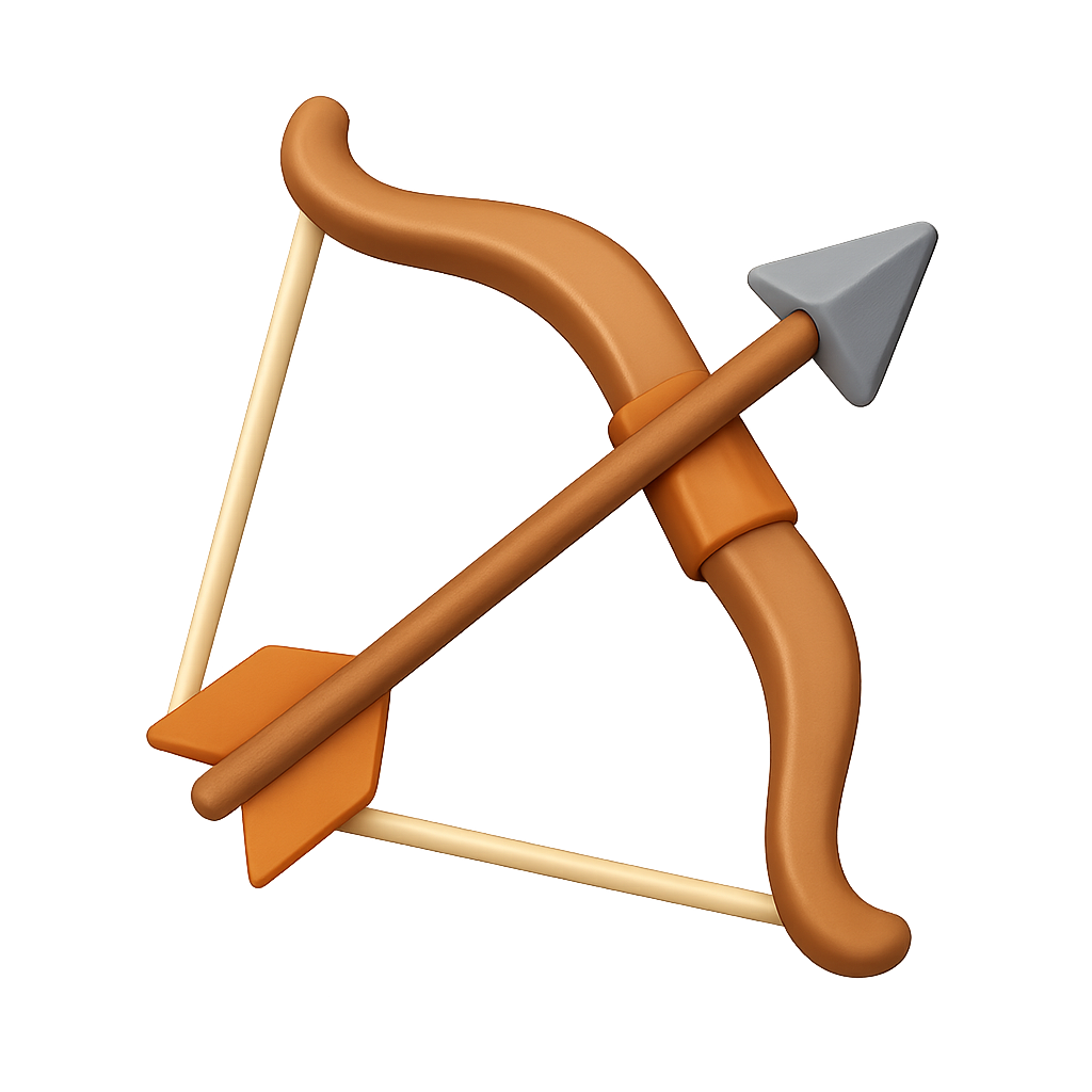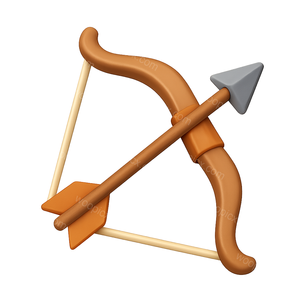 A colorful 3D representation of a bow and arrow, featuring a wooden bow with a sleek arrow ready to shoot. Ideal for gaming and graphic design.