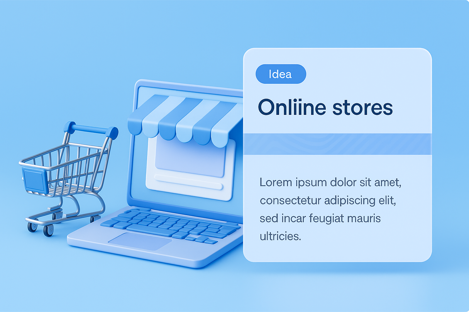 /Collection: /by davooda/Type: PNG/A soft blue background featuring a 3D illustration of a shopping cart and a laptop. The laptop displays an online store interface, emphasizing the concept of e-commerce.
