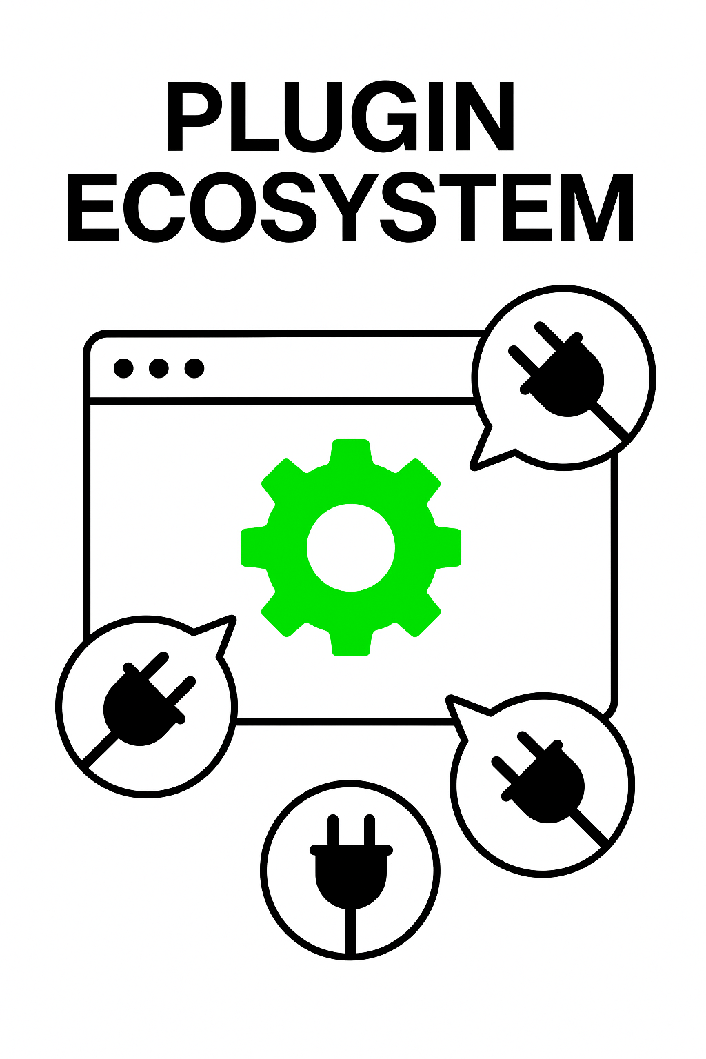 Minimalist graphic representing a plugin ecosystem, featuring a central gear symbol and plug icons, designed for tech-related content or software documentation.