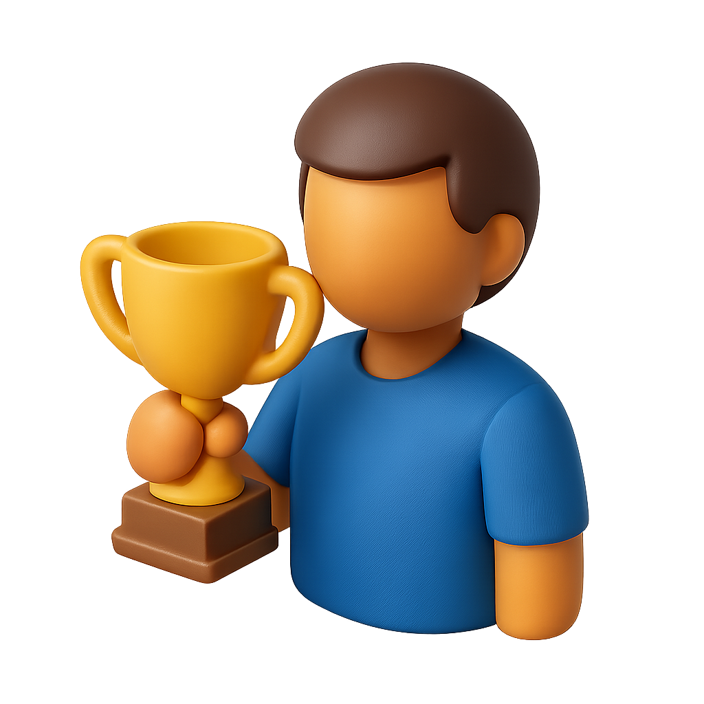 A stylized 3D character holding a trophy, depicted in a vibrant isometric view. The figure features a simple design with a blue shirt and a golden trophy, set against a soft gradient background.