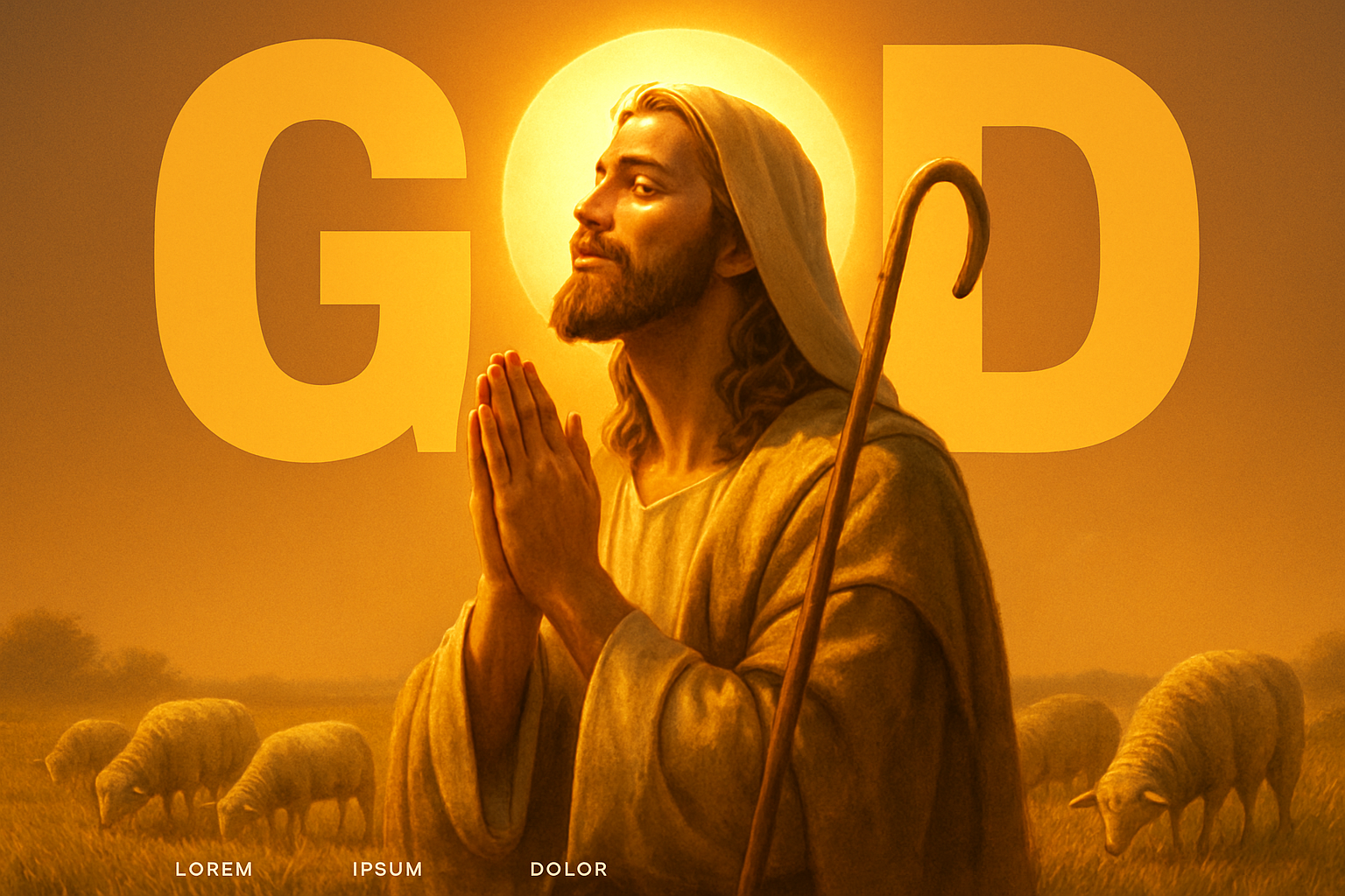 /Collection: /by davooda/Type: PNG/A powerful image of Jesus Christ as a shepherd, praying in a sunlit field, surrounded by sheep. The scene is rendered in a detailed 3D style with a bold, minimalistic layout featuring a large headline.