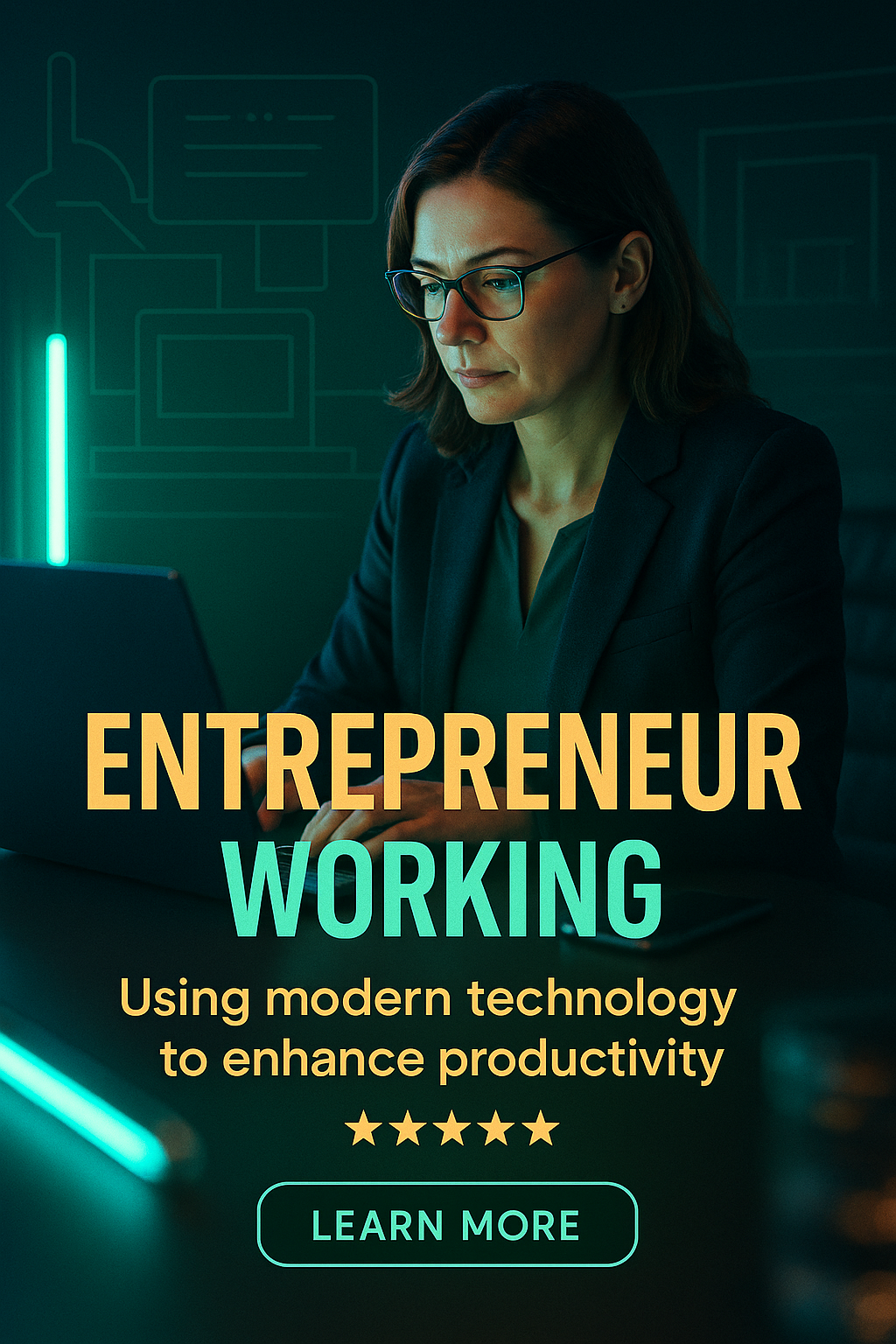 /Collection: /by davooda/Type: PNG/Engaging image of a focused entrepreneur utilizing modern technology to enhance productivity. The dark background contrasts with neon elements, creating a contemporary feel perfect for business-oriented marketing.