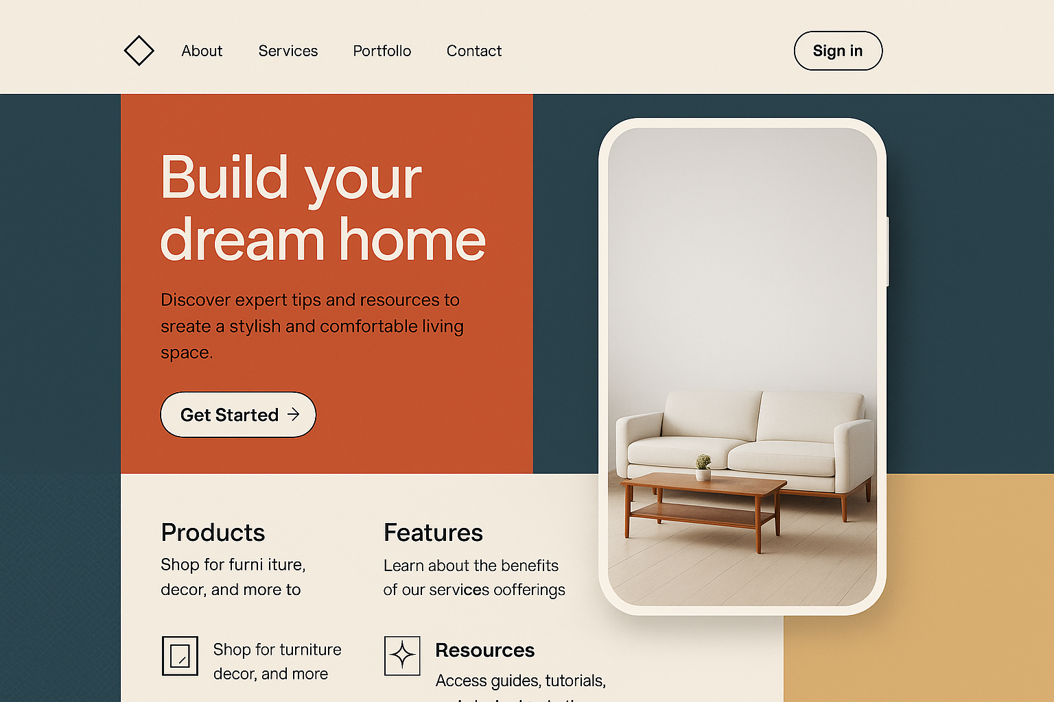/Collection: /by davooda/Type: PNG/A sleek, modern landing page featuring a white sofa and wooden coffee table. The design incorporates vibrant color blocks, clean typography, and a prominent action button.