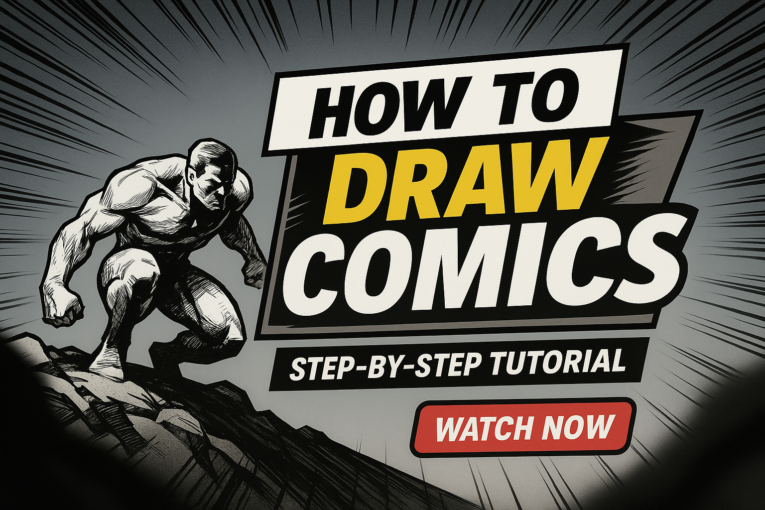 Dynamic promotional graphic for a comic drawing tutorial, featuring bold typography and a superhero illustration that engages aspiring artists. Ideal for online learning platforms.