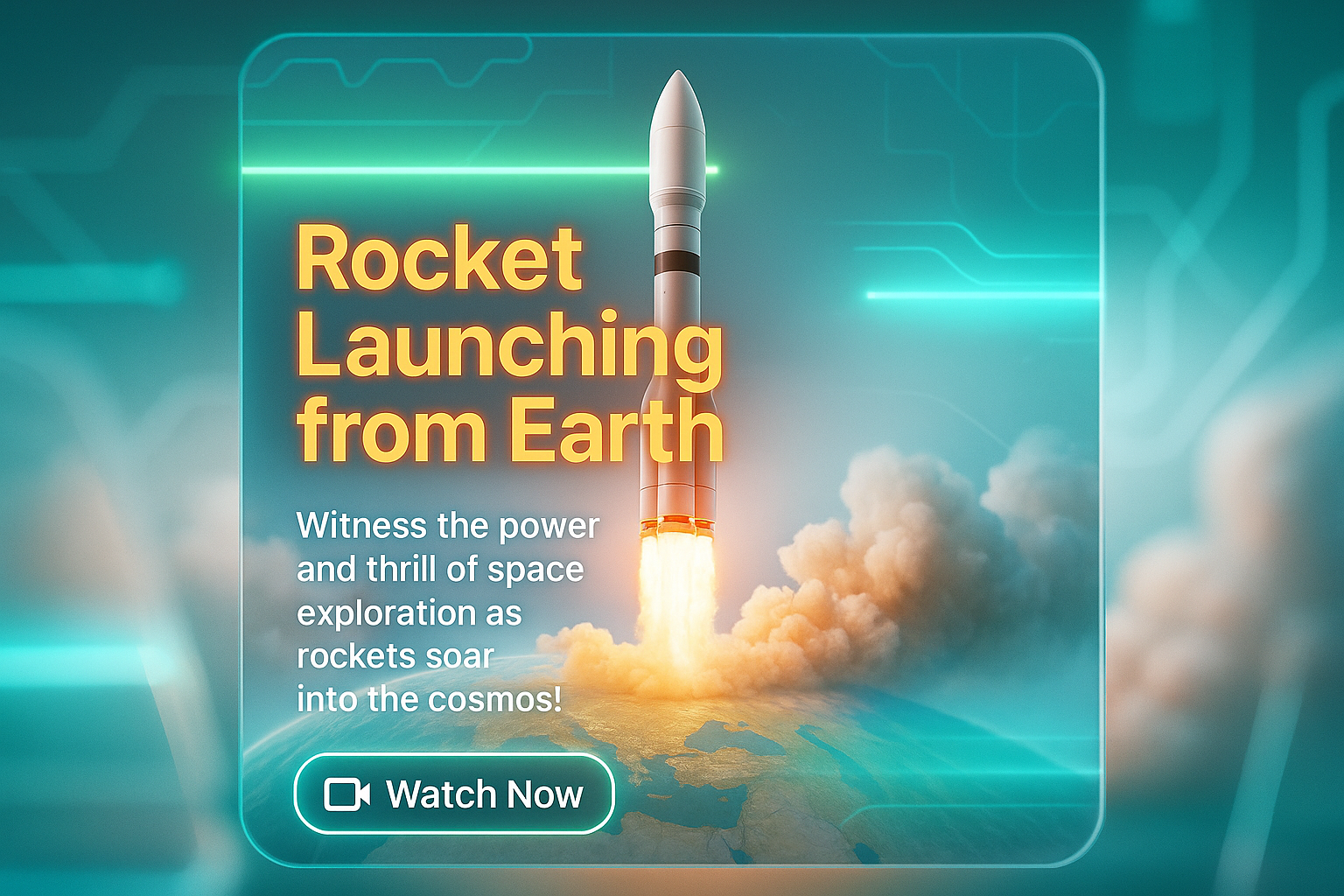 Space Exploration Promotional Graphic Featuring a Rocket and Nebula