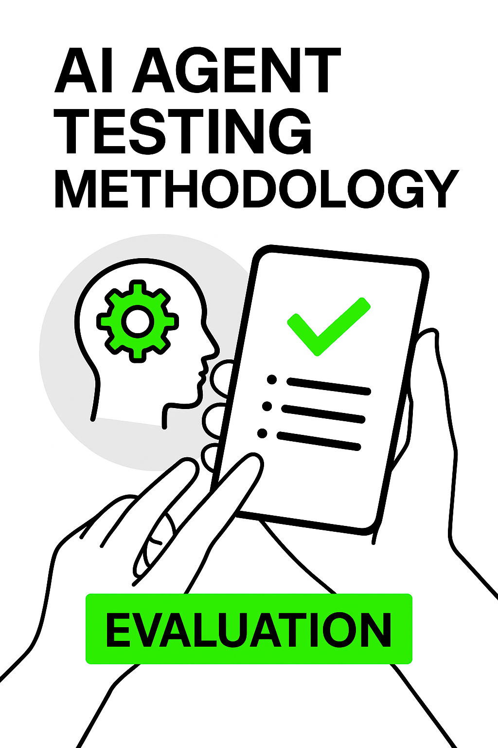 Illustrative graphic representing AI agent testing methodology with a focus on evaluation. Features a modern line art style and clear visual elements, suitable for tech-related presentations.