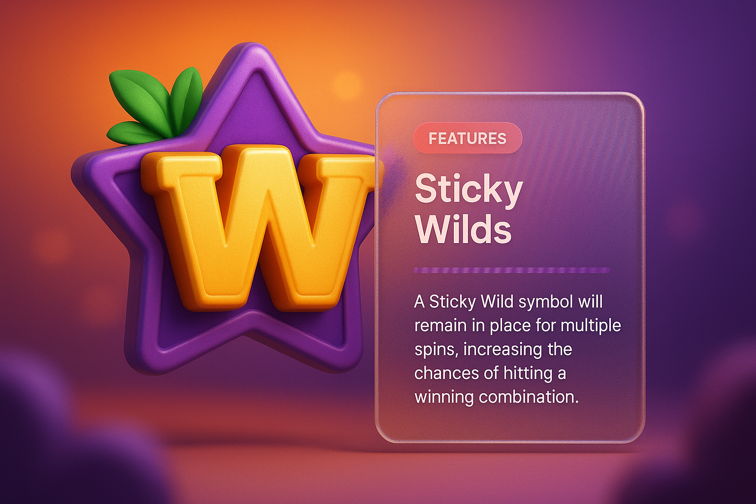 A vibrant 3D illustration of the 'Sticky Wilds' game feature, showcasing a star-shaped icon with a bold 'W' and a transparent informational block beside it.