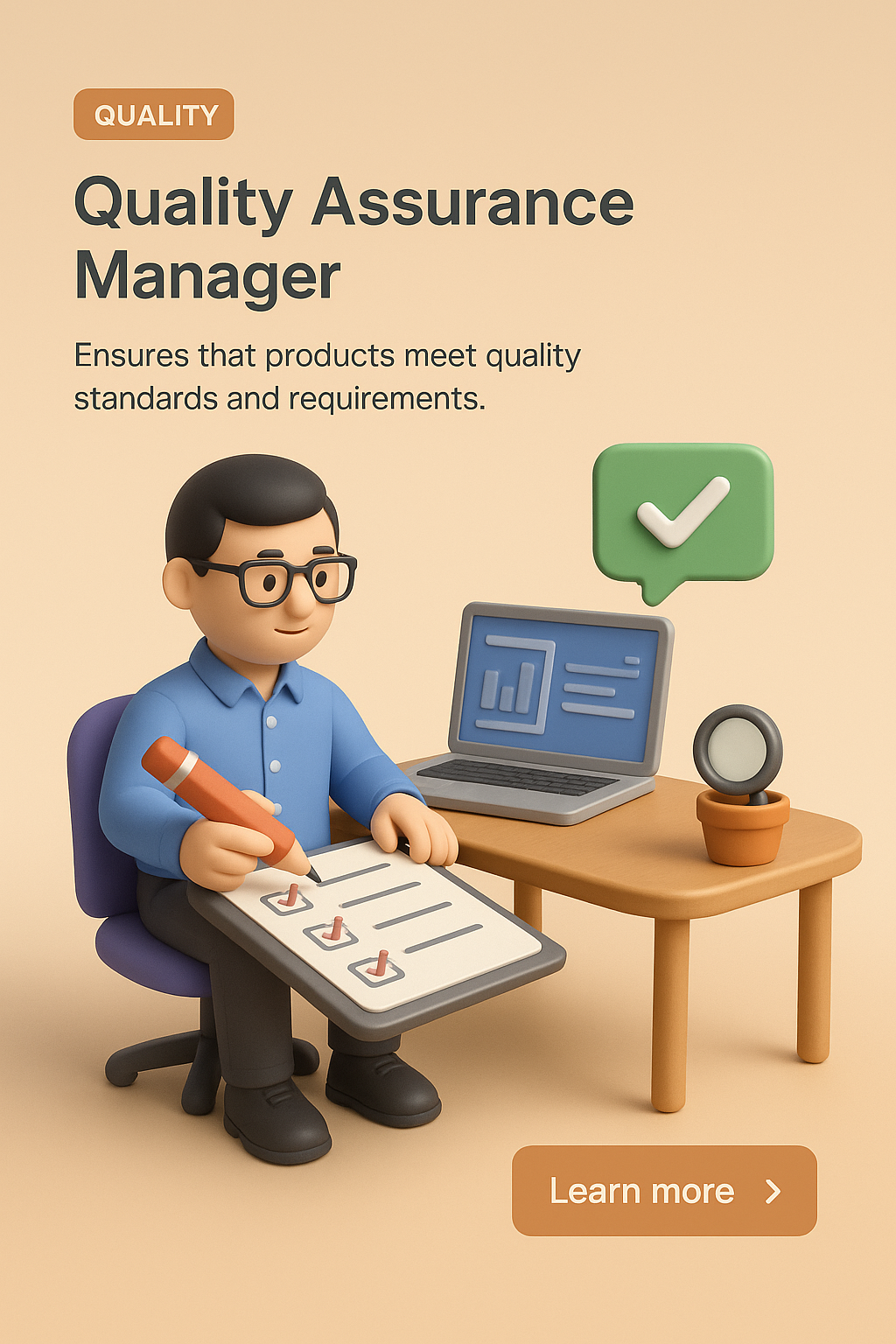 /Collection: /by davooda/Type: PNG/A detailed 3D illustration showcasing a Quality Assurance Manager reviewing documents. The scene is zoomed out, featuring a desk with a laptop, checklist, and a potted plant.