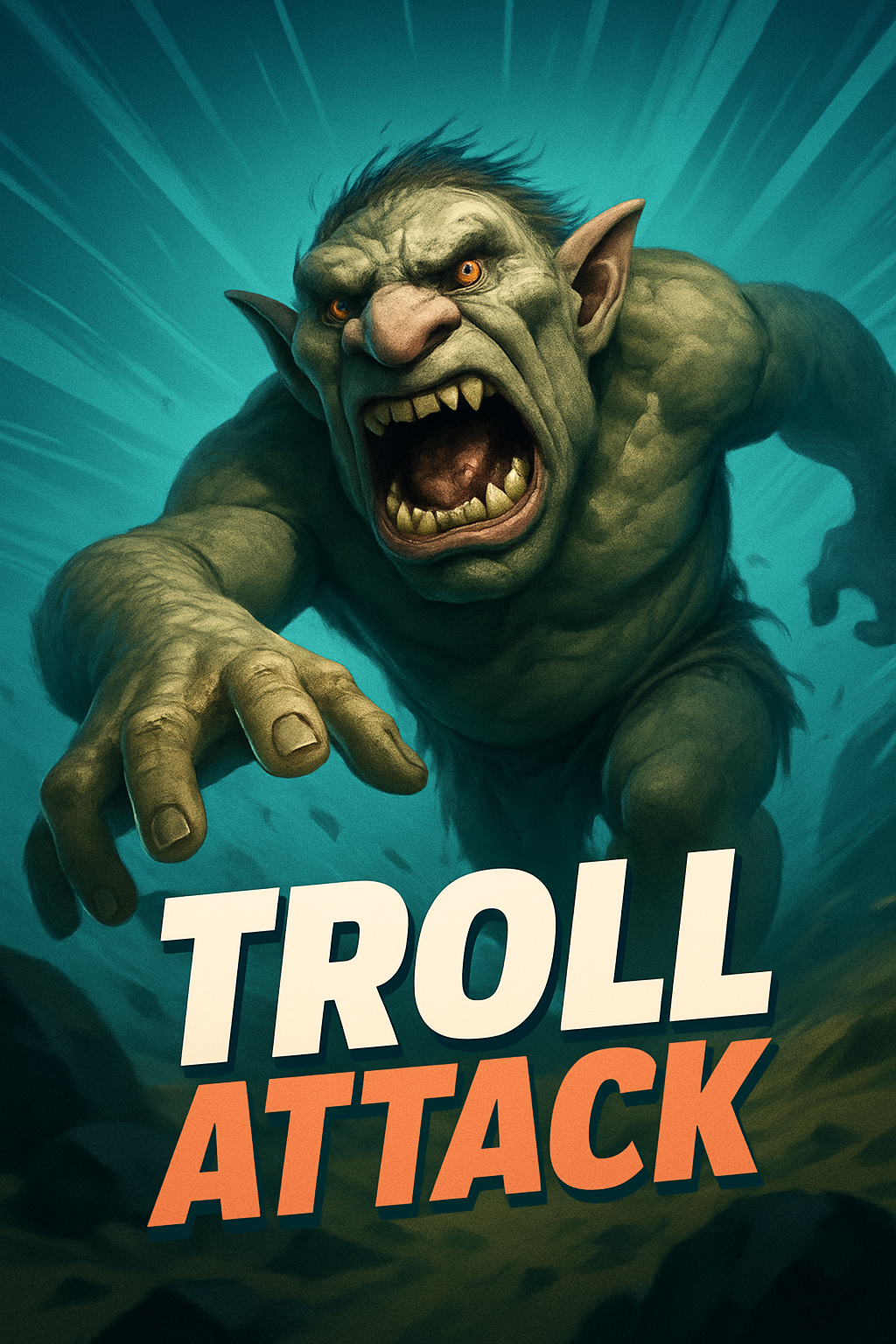 A fierce troll lunges forward with an aggressive expression, showcasing sharp teeth and muscular features. The background features a smooth gradient, enhancing the dynamic feel of the scene.