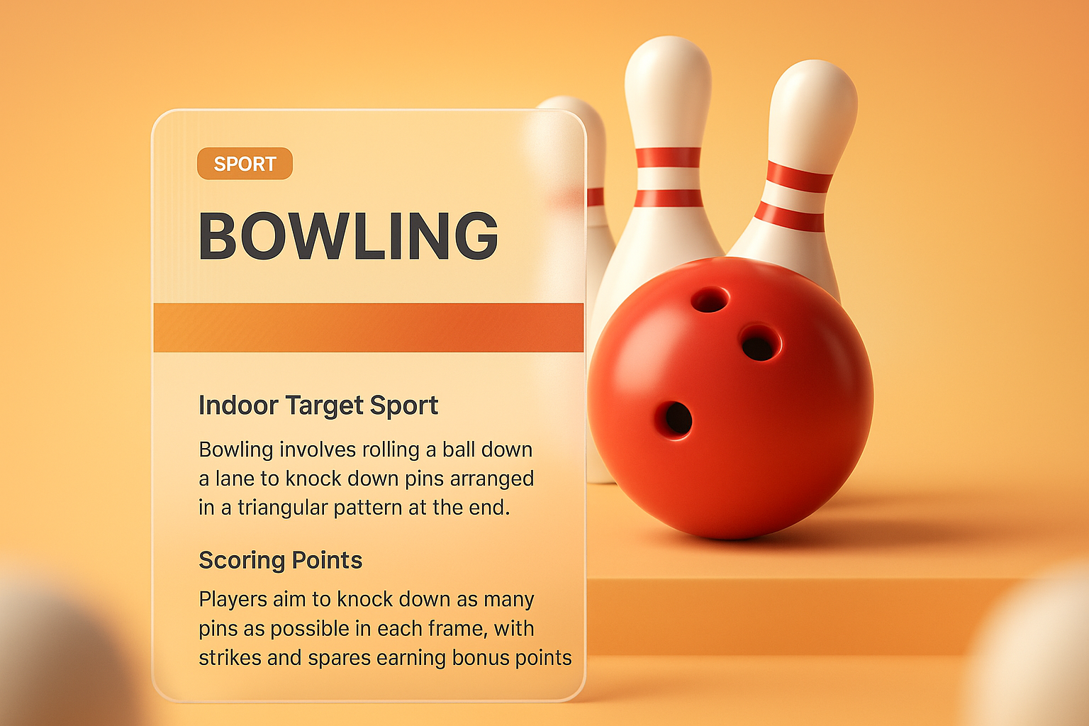 A vibrant webpage design featuring a 3D bowling ball and pins. The layout includes a transparent panel with text and information about bowling, creating a modern and engaging design.