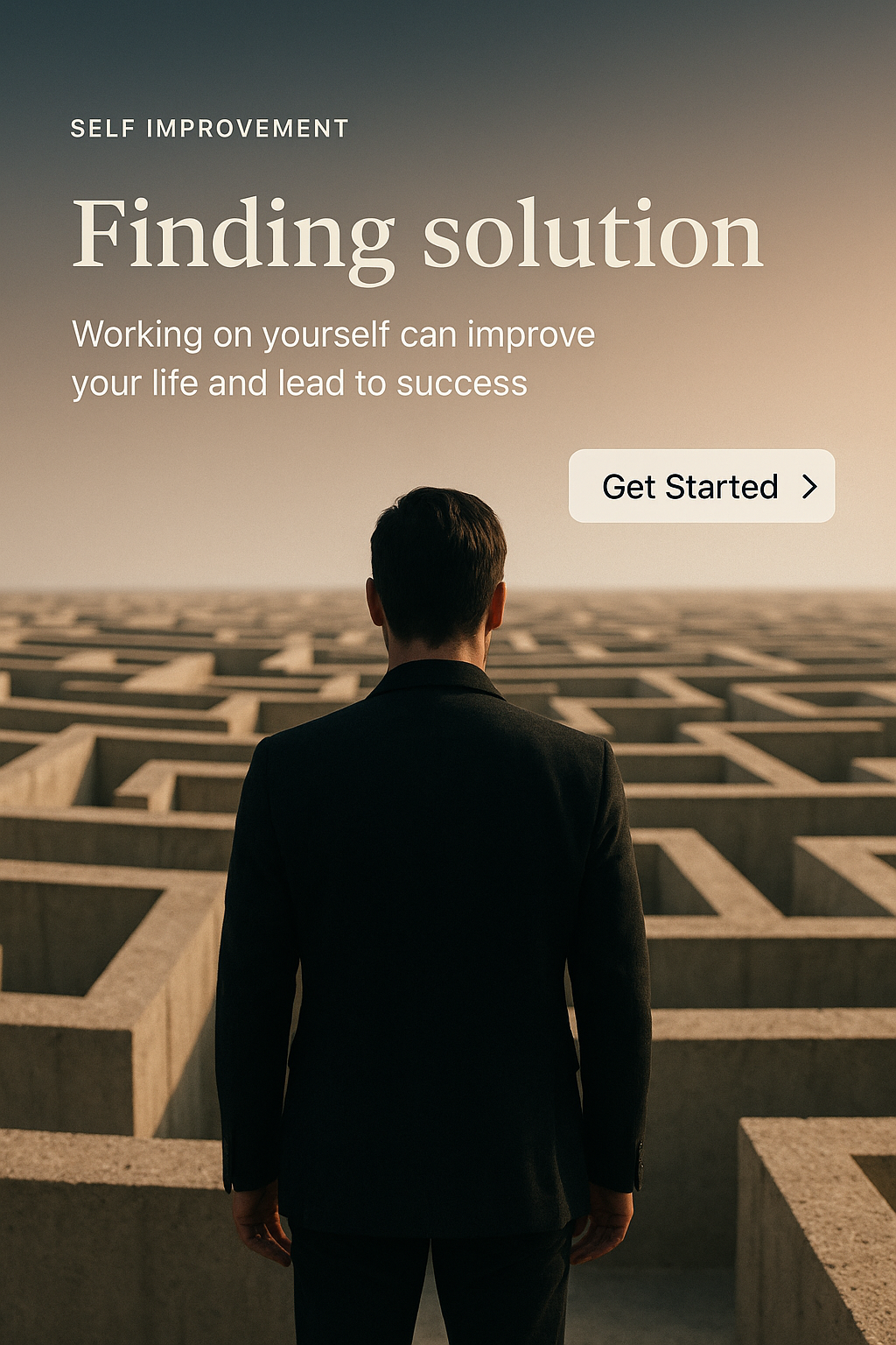 /Collection: /by davooda/Type: PNG/A silhouette of a man stands at the entrance of a maze, symbolizing the quest for self-improvement. The scene features a gradient background transitioning from dark to light, creating a contemplative atmosphere.