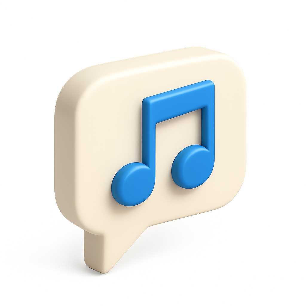 A 3D icon depicting a speech bubble featuring blue music notes. The design is isometric with a transparent background, giving it a modern and volumetric appearance.