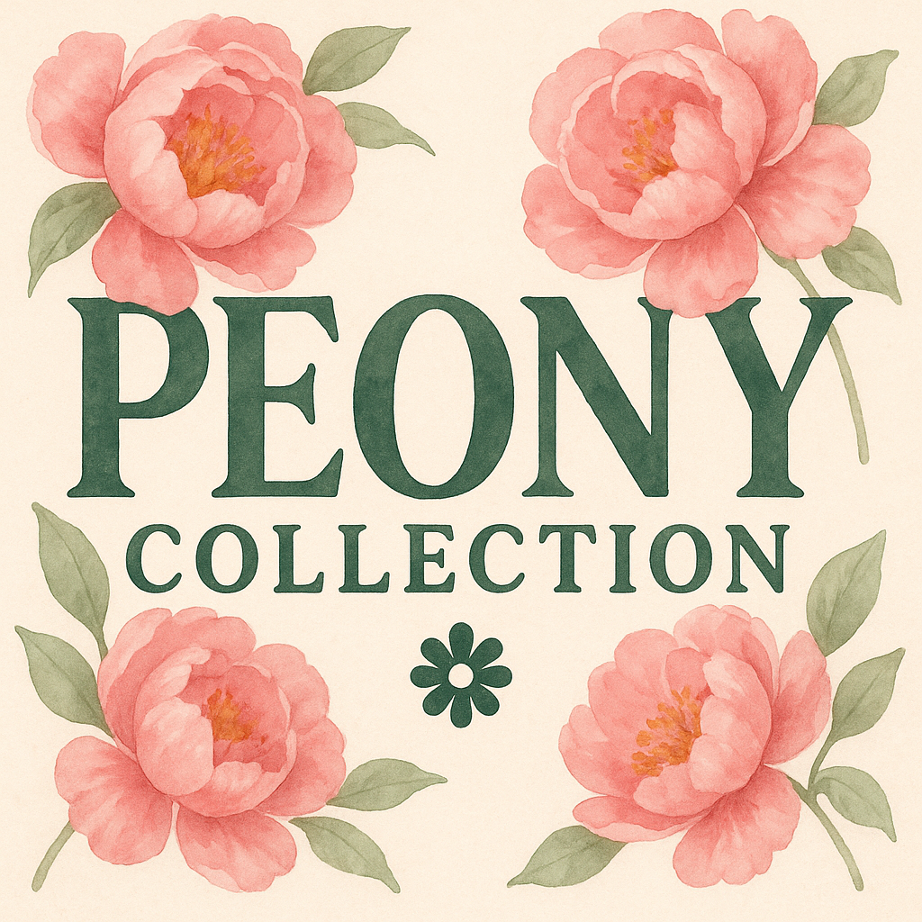 Charming floral graphic showcasing peonies with a vintage aesthetic, perfect for branding or promotional materials related to floral products or collections.