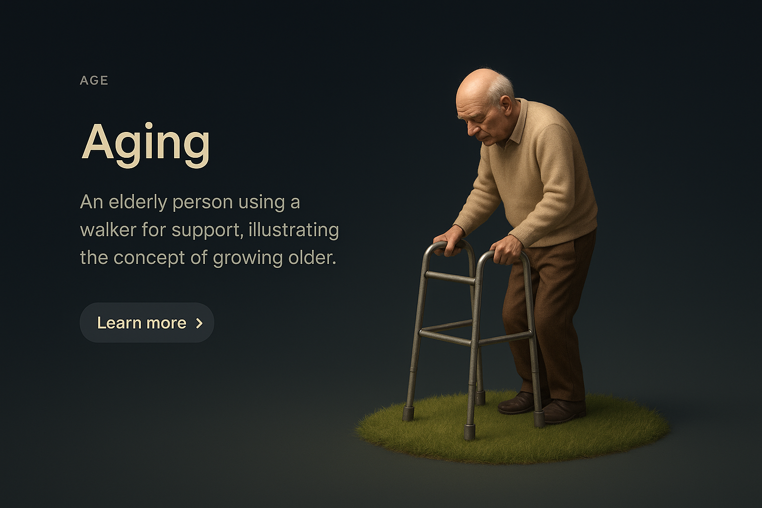 /Collection: /by davooda/Type: PNG/A detailed 3D illustration of an elderly person using a walker, set against a dark gradient background. The scene captures the essence of aging with a focus on realism.