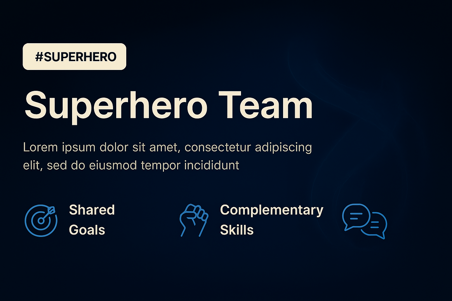 /Collection: /by davooda/Type: PNG/A sleek graphic representing a superhero team concept, featuring key attributes like shared goals and complementary skills, ideal for team-building presentations.