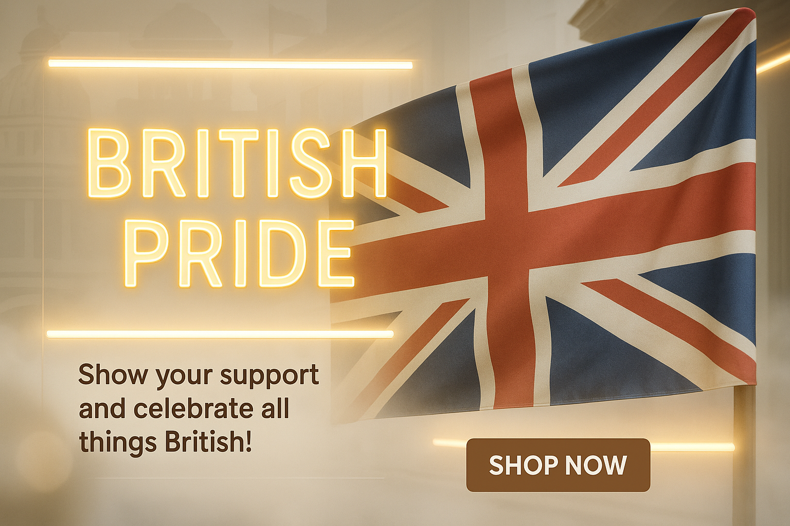 Vibrant promotional banner showcasing the British flag with a modern design, ideal for marketing campaigns celebrating British culture and products.