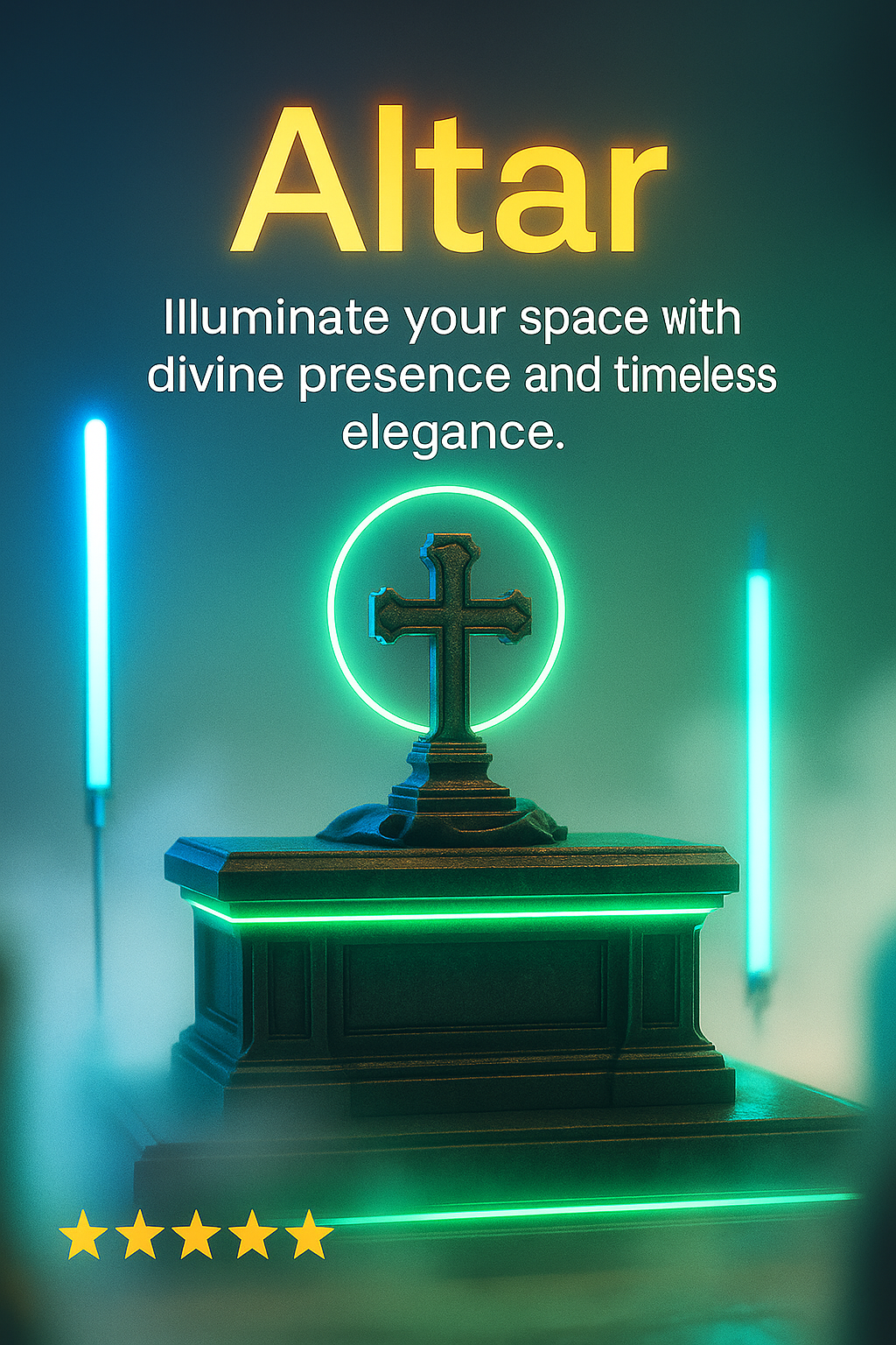 Изображение реалистичного неонового алтаря с яркими акцентами. Главный элемент - крест, окруженный неоновыми огнями и дымом, создающим ауру святости.