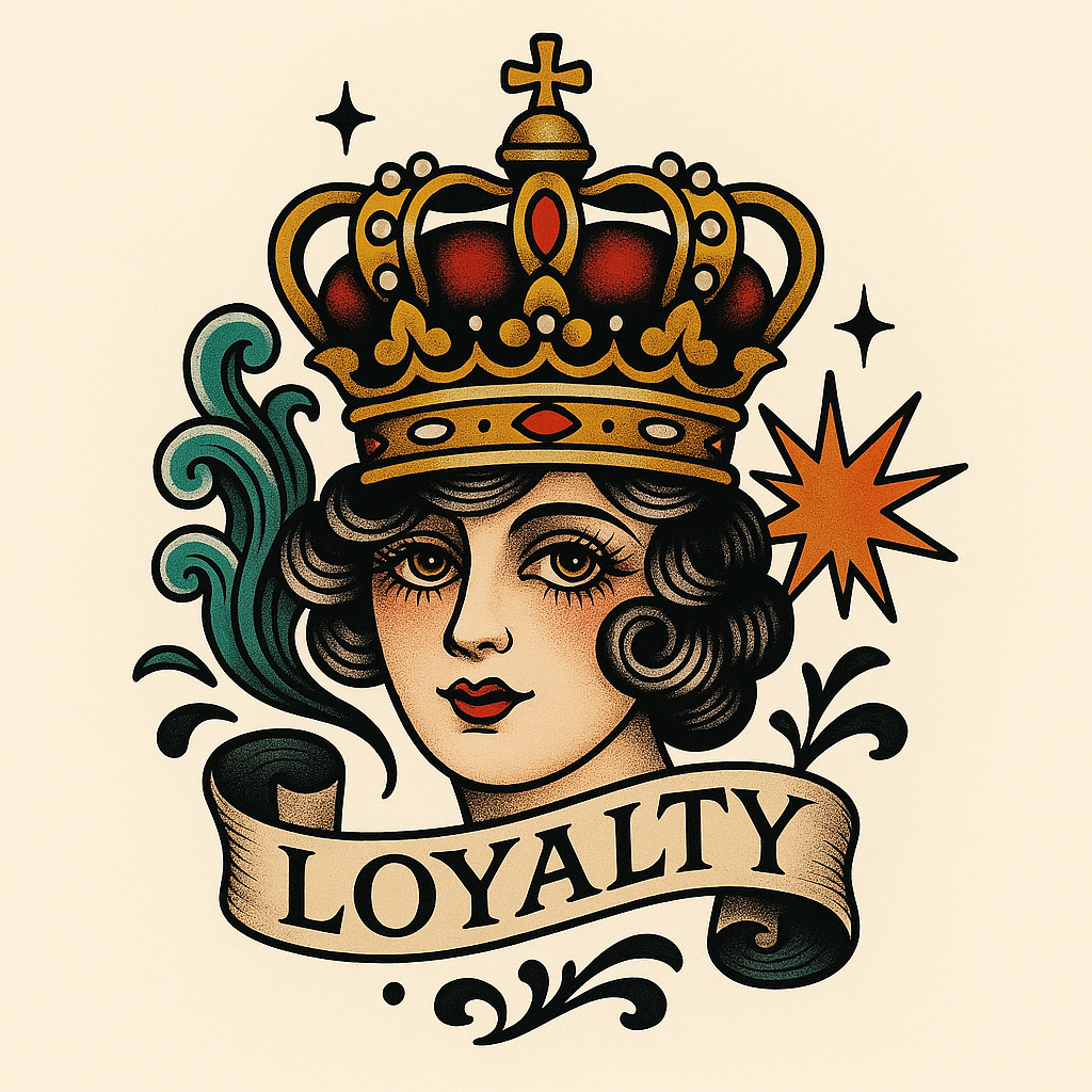 /Collection: /by davooda/Type: PNG/A vibrant tattoo-inspired illustration of a crowned woman with flowing hair, adorned with a banner reading 'LOYALTY'. This artwork blends traditional and modern design elements, ideal for tattoo enthusiasts or decorative prints.