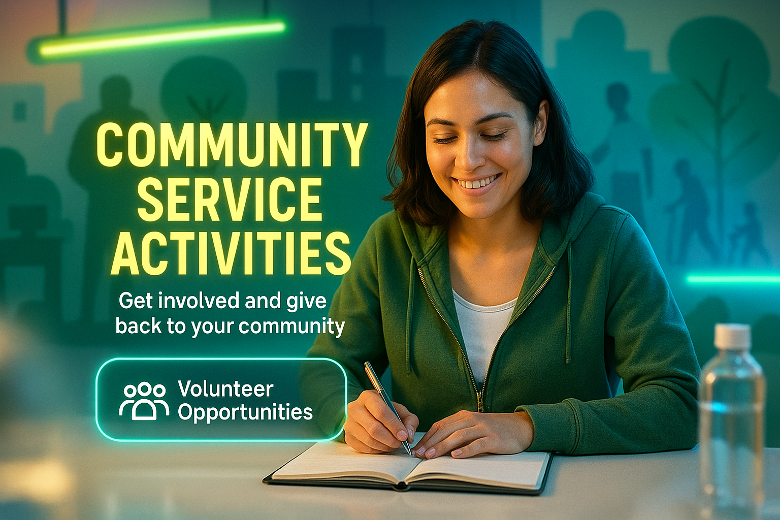 Vibrant social media post promoting community service activities, featuring a smiling young woman writing, ideal for encouraging volunteerism.