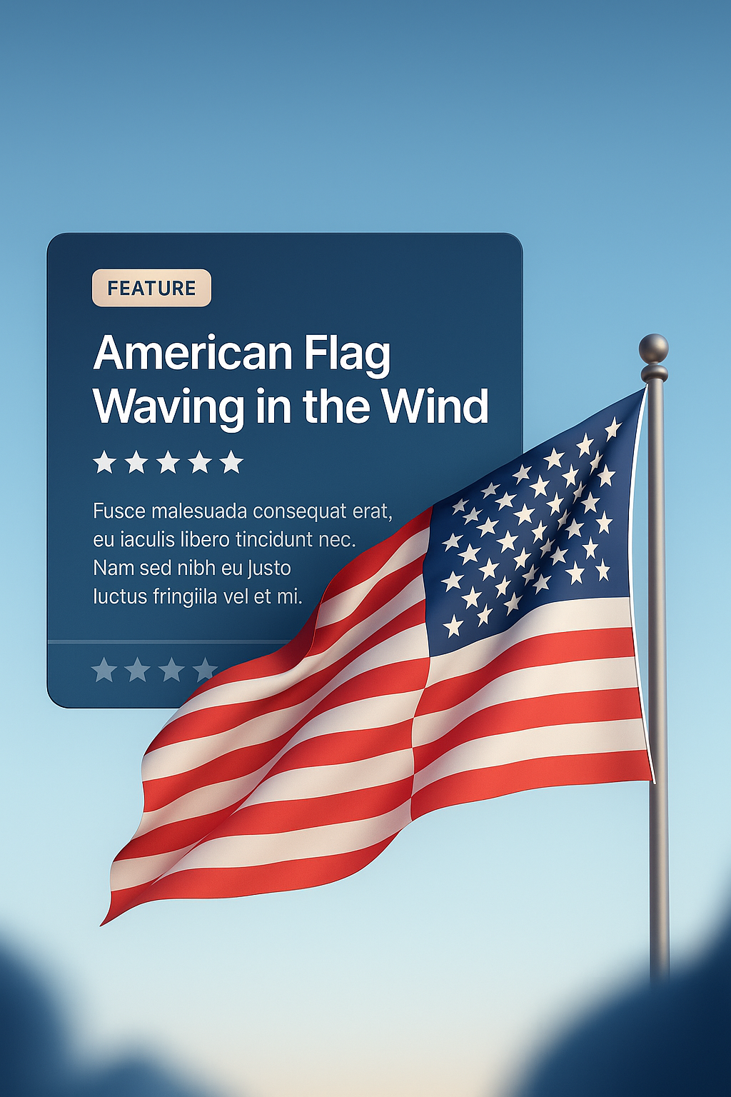 /Collection: /by davooda/Type: PNG/An American flag prominently waving in the wind against a soft gradient background. A feature block overlays the image, detailing attributes with complementary design elements.