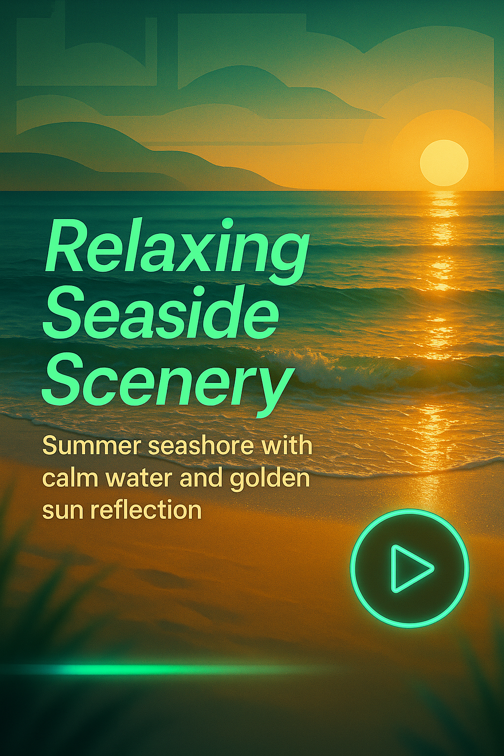 Vibrant digital artwork depicting a tranquil seaside scene at sunset, featuring calm waters and a golden sun reflection, perfect for relaxation-themed content.