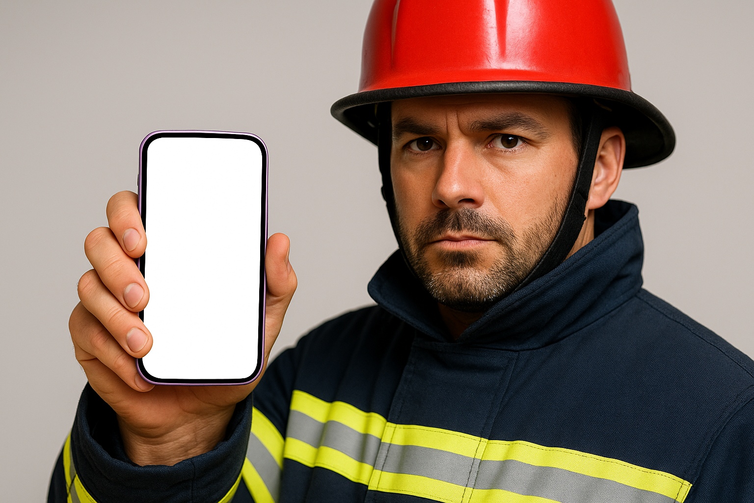 A firefighter in uniform, wearing a red helmet, holds a purple smartphone with a blank screen. The background is neutral, emphasizing the firefighter's serious expression.