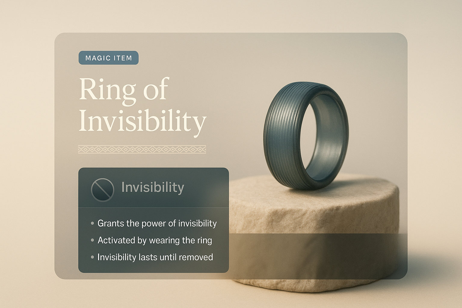 A 3D illustration of a ring symbolizing invisibility, placed on a stone pedestal. The design features a transparent overlay with descriptive text and a modern aesthetic.