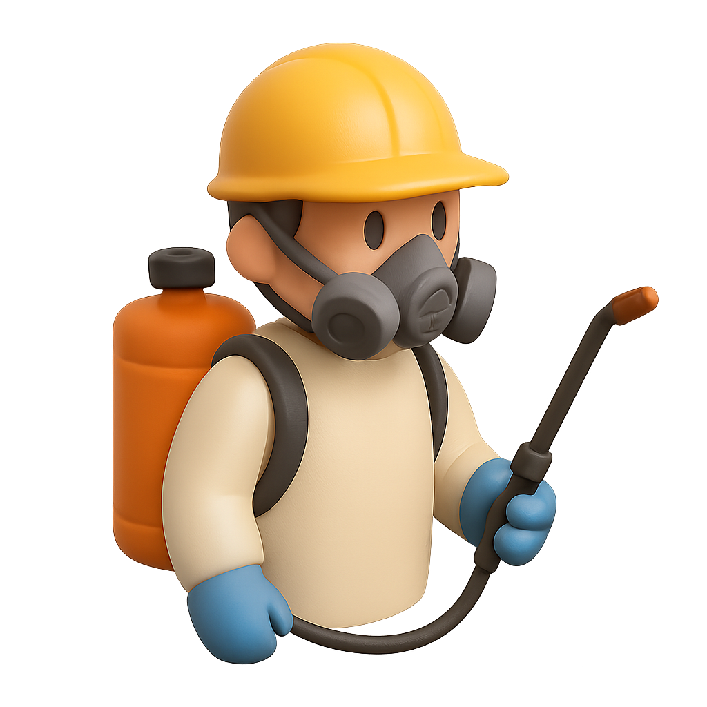 A 3D icon of a pest control technician wearing a yellow helmet and a gas mask, holding a sprayer. The design has a transparent background and showcases a volumetric, isometric view.
