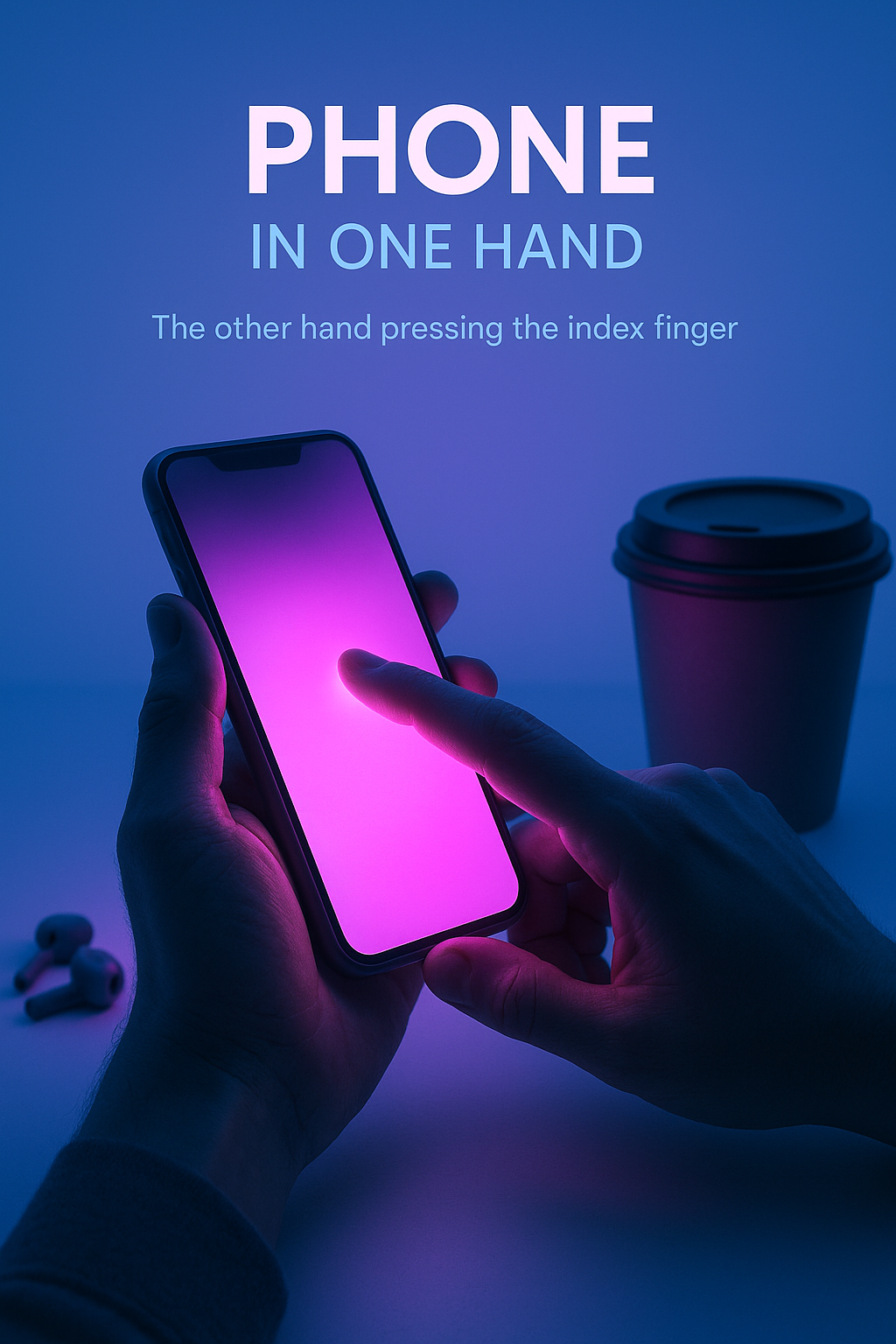 An artistic composition featuring a hand pressing a phone screen, glowing neon pink. The background is a solid blue, enhancing the atmosphere with cool shades. Coffee cup and earphones are visible.