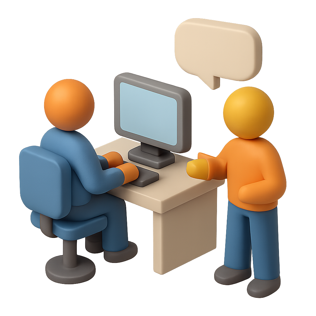 /Collection: /by davooda/Type: PNG/A stylized 3D icon depicting two figures engaged in conversation. One person is seated at a computer, while the other stands nearby, gesturing. The design features a transparent background and an isometric view.