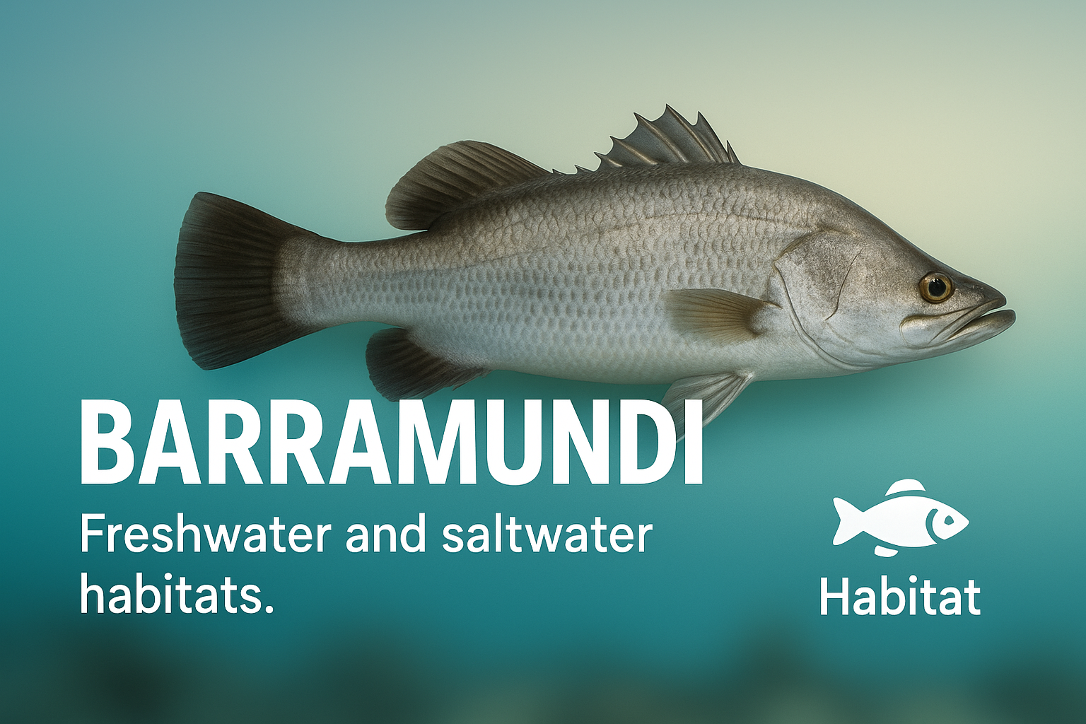 /Collection: /by davooda/Type: PNG/Informative graphic featuring a detailed illustration of a Barramundi fish, highlighting its habitats in freshwater and saltwater, ideal for educational content.