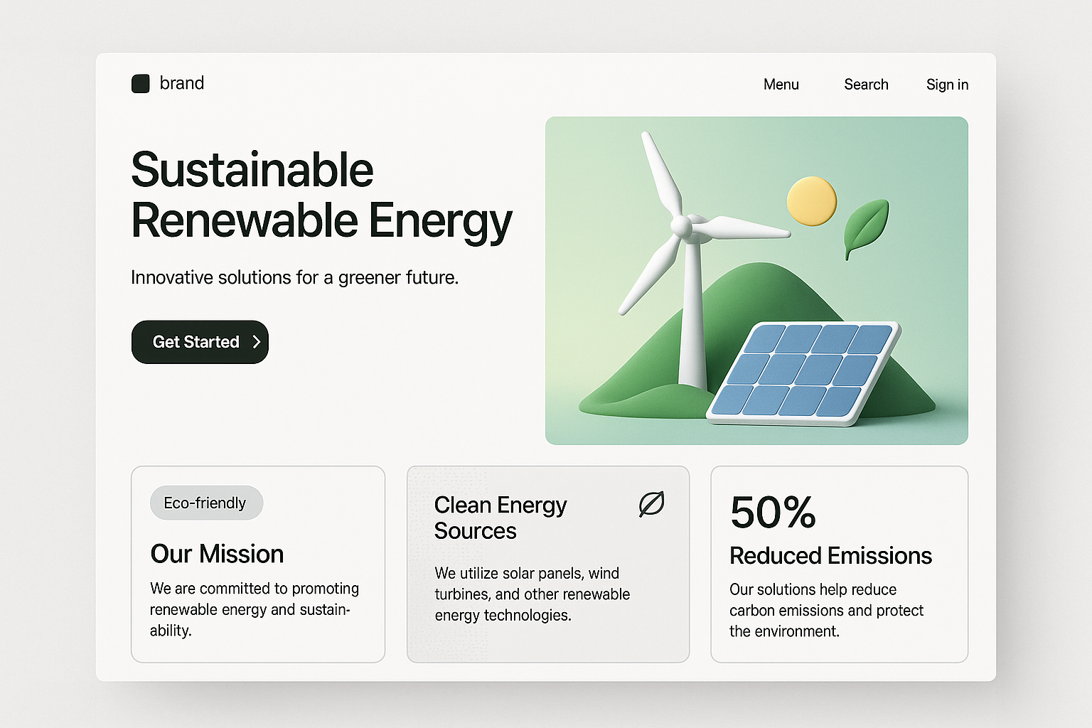 A sleek landing page concept featuring sustainable energy elements like wind turbines and solar panels. The design incorporates a clean layout with small fonts and a minimalistic aesthetic.