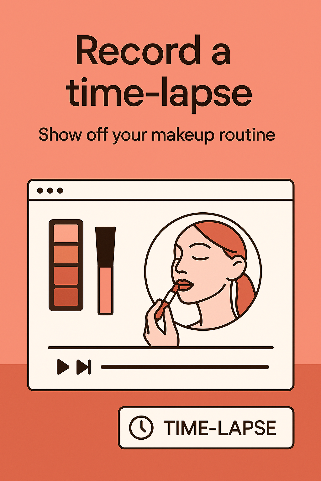 /Collection: /by davooda/Type: PNG/A promotional graphic designed for makeup tutorials, featuring a playful illustration of a woman applying makeup with a modern interface showcasing a time-lapse feature, ideal for social media use.