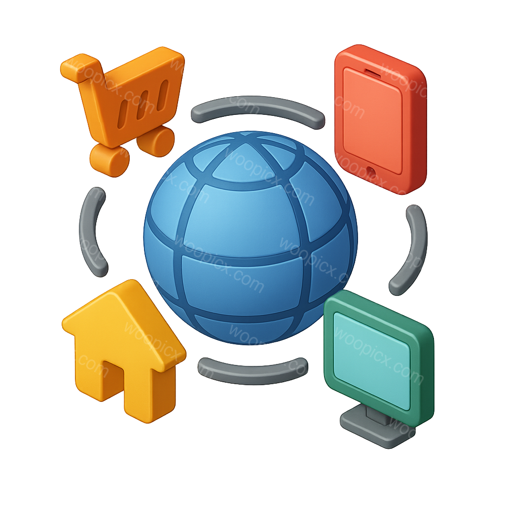 A vibrant 3D icon representing an omnichannel network, featuring a globe surrounded by shopping cart, smartphone, house, and computer icons, all in a three-quarter view.