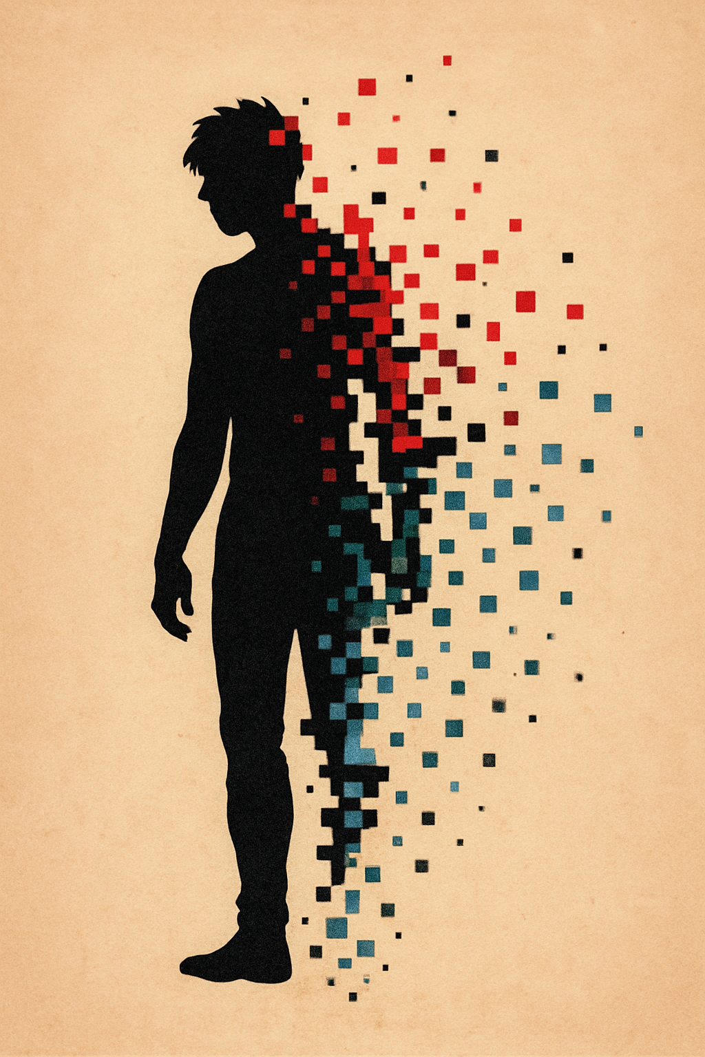 /Collection: /by davooda/Type: PNG/A creative tattoo design featuring a silhouette dissolving into pixels. The figure is depicted in black against a soft beige background, with vibrant red, blue, and black pixels transitioning outward.