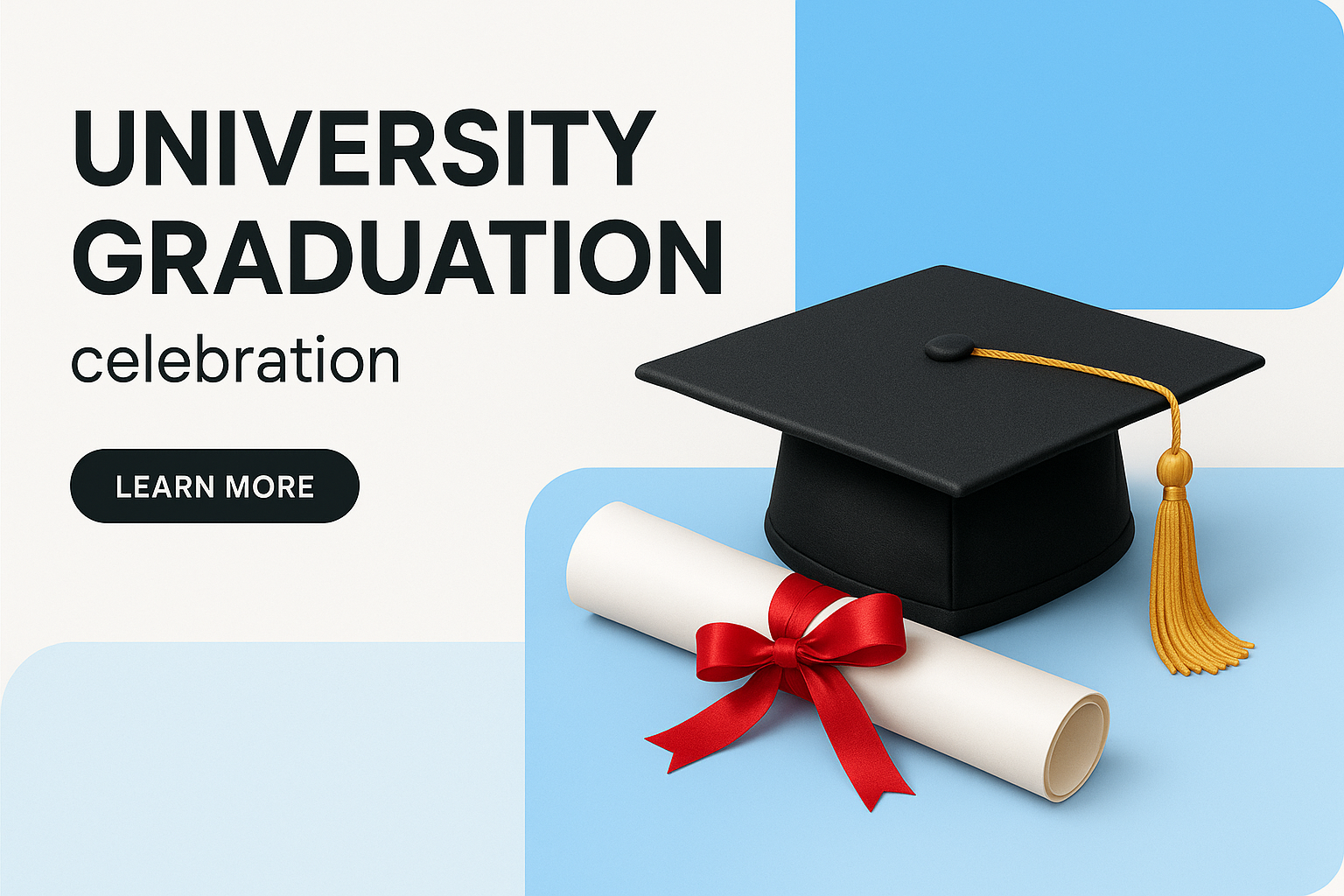 A clean and professional university graduation celebration design featuring a graduation cap, diploma with a red ribbon, and bold typography. The layout is modern and well-balanced.