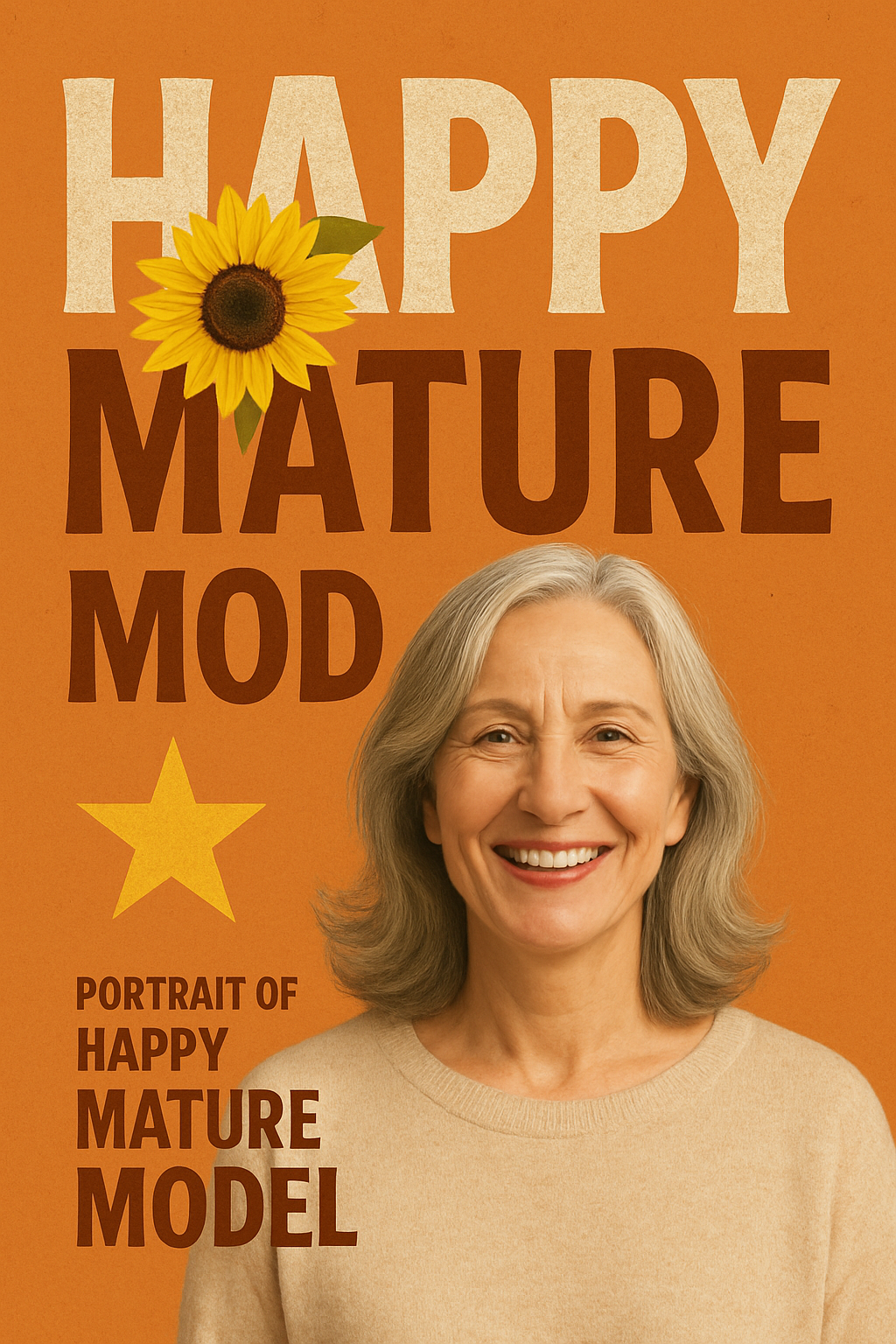 /Collection: /by davooda/Type: PNG/A warm and inviting portrait showcasing a happy mature model. The design features a sunflower accent and bold typography against an orange background, suitable for promotional or inspirational content.