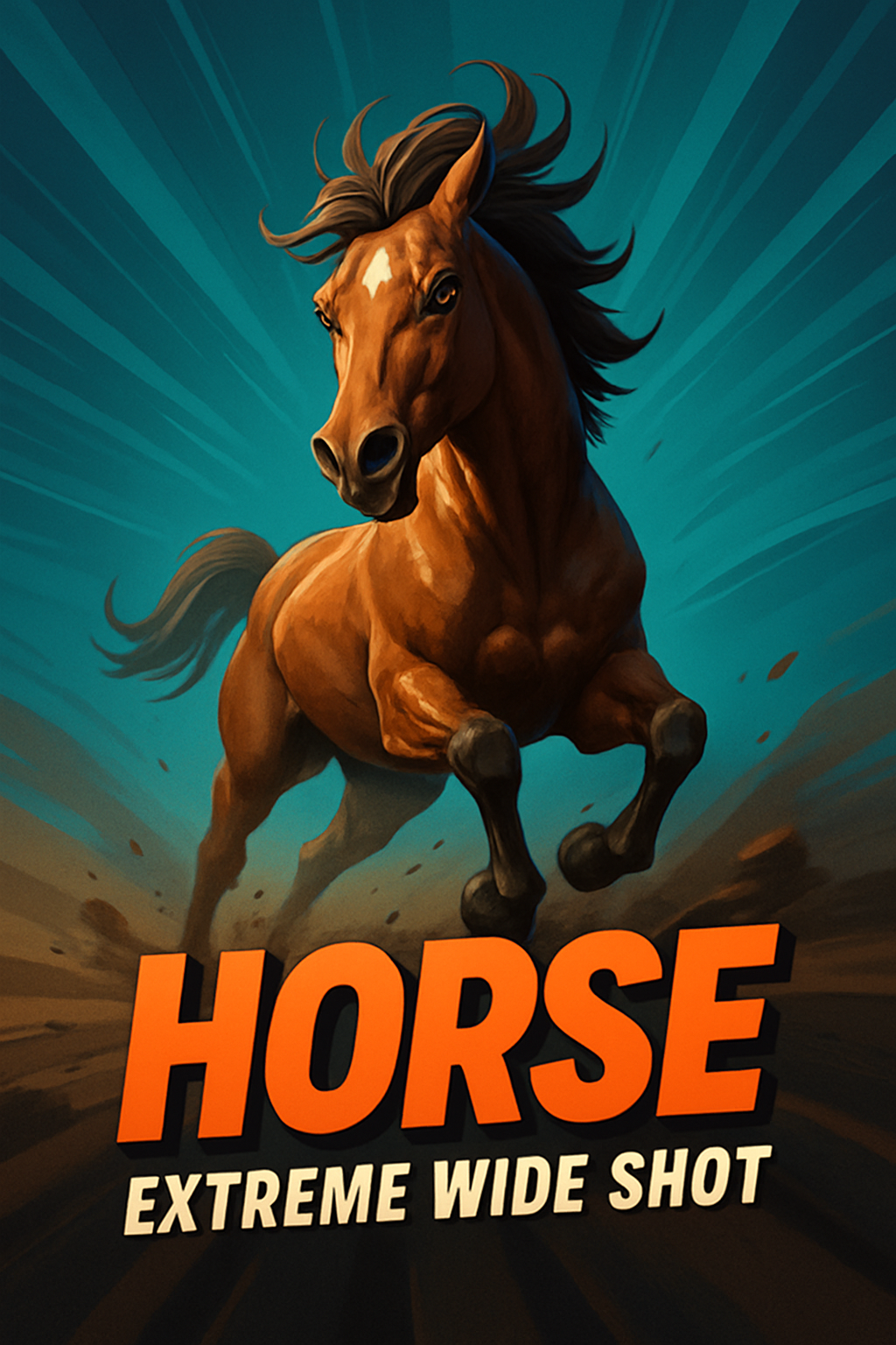 A stunning depiction of a horse captured in an extreme wide shot, showcasing its powerful movement. The background features a smooth gradient that enhances the dynamic feel, with rays emanating from the center.