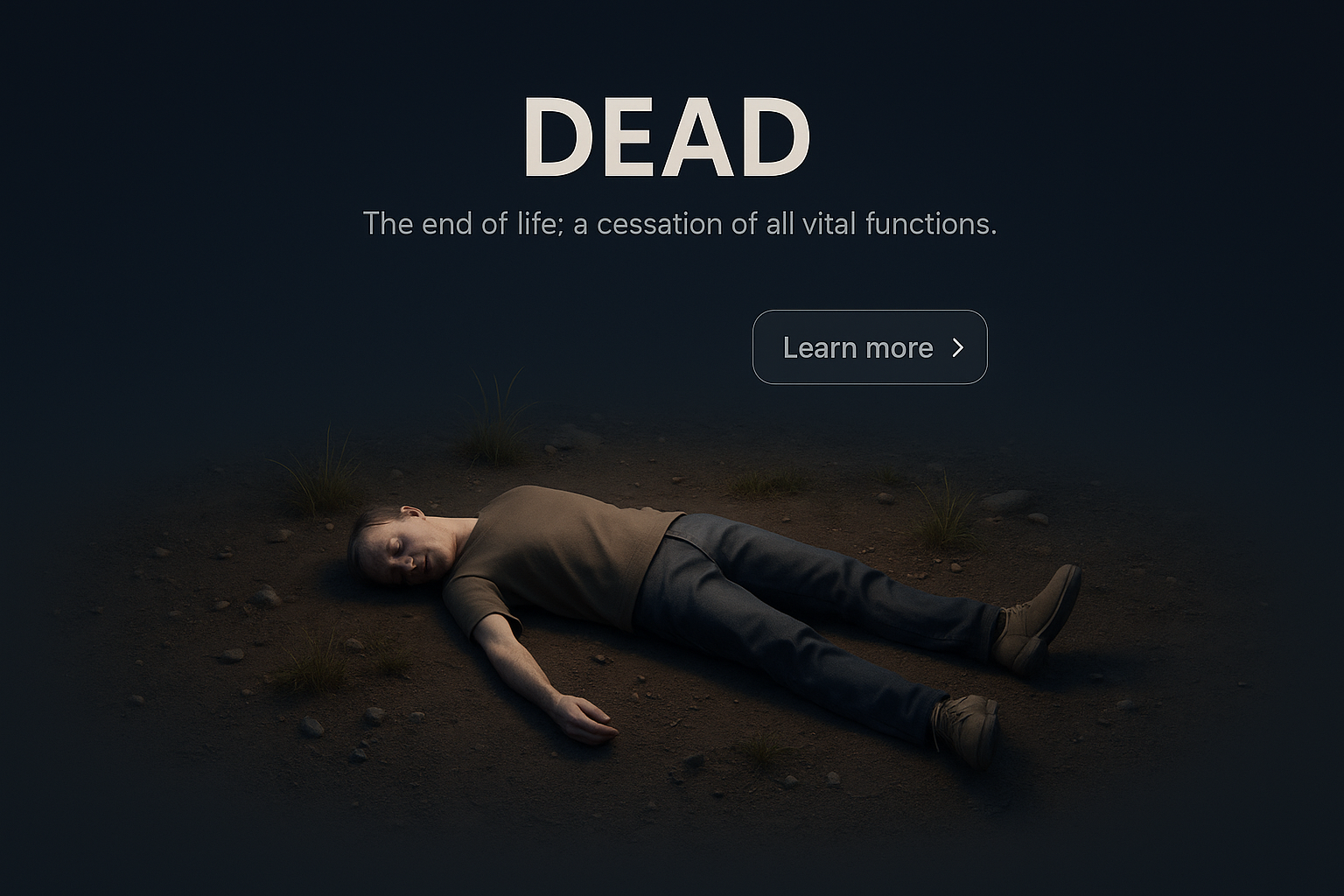 A detailed 3D scene showing a lifeless figure on the ground, surrounded by a dark gradient background. The design includes subtle text elements and a call-to-action button.