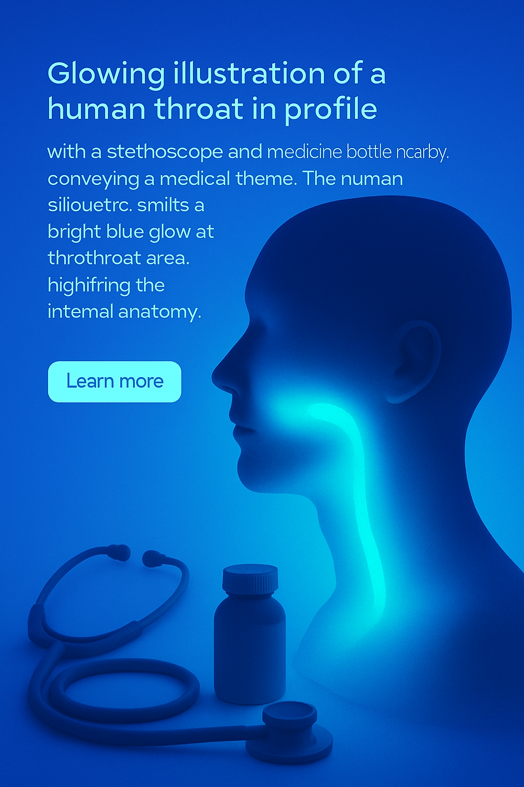 A glowing illustration of a human throat in profile, emitting a blue glow. Accompanied by a stethoscope and a medicine bottle, enhancing its medical theme.