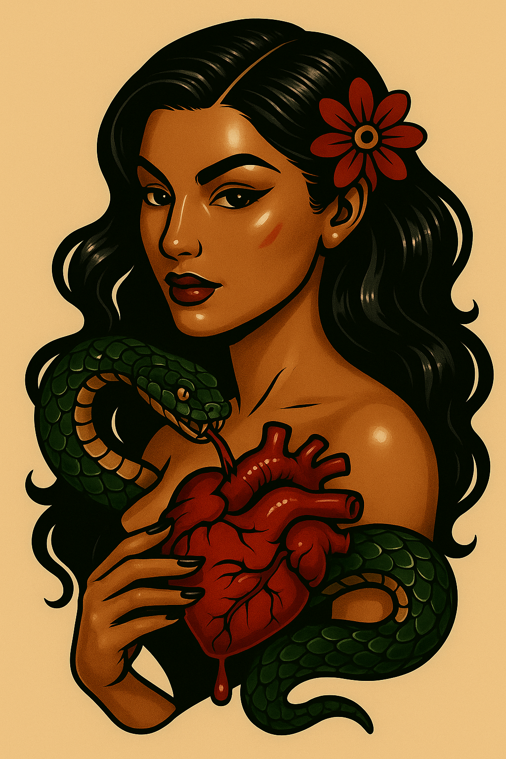 This striking image features a woman holding a heart, with a snake biting into it. The style resembles classic tattoos but with a glossy, refined finish, set against a soft beige background.