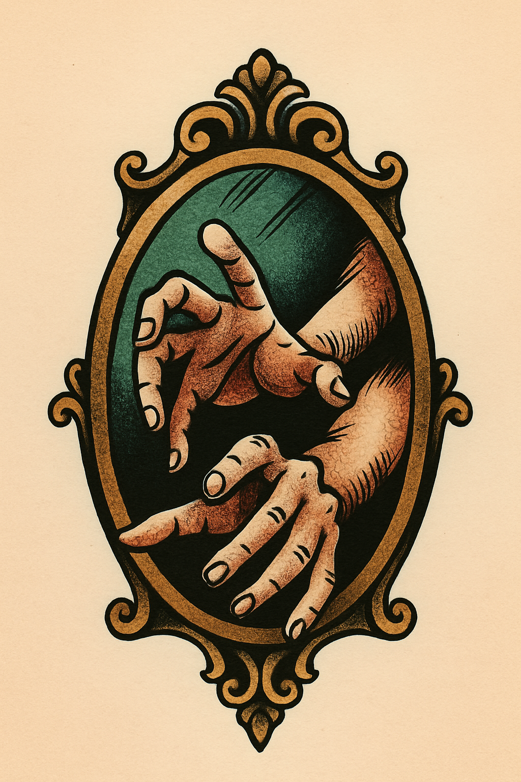 Hands Reaching from a Mirror in a Classic Tattoo Style