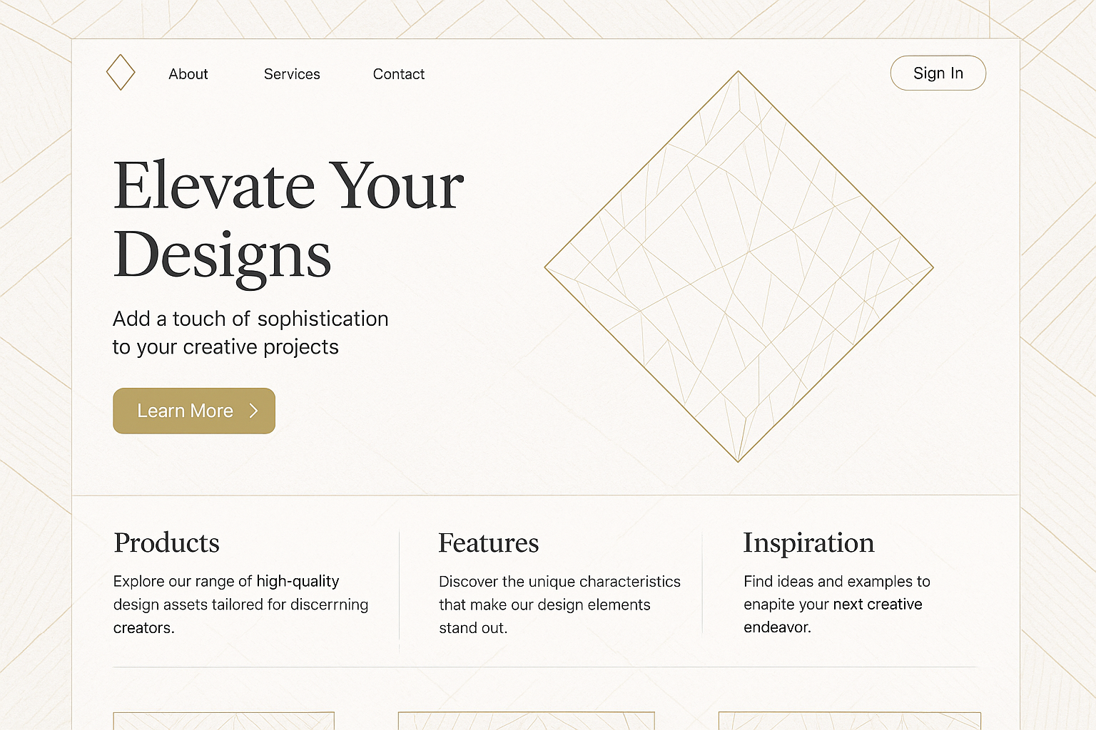 /Collection: /by davooda/Type: PNG/A sophisticated landing page featuring geometric gold lines on a white background. Includes sections for products, features, and inspiration with a prominent sign-in button.
