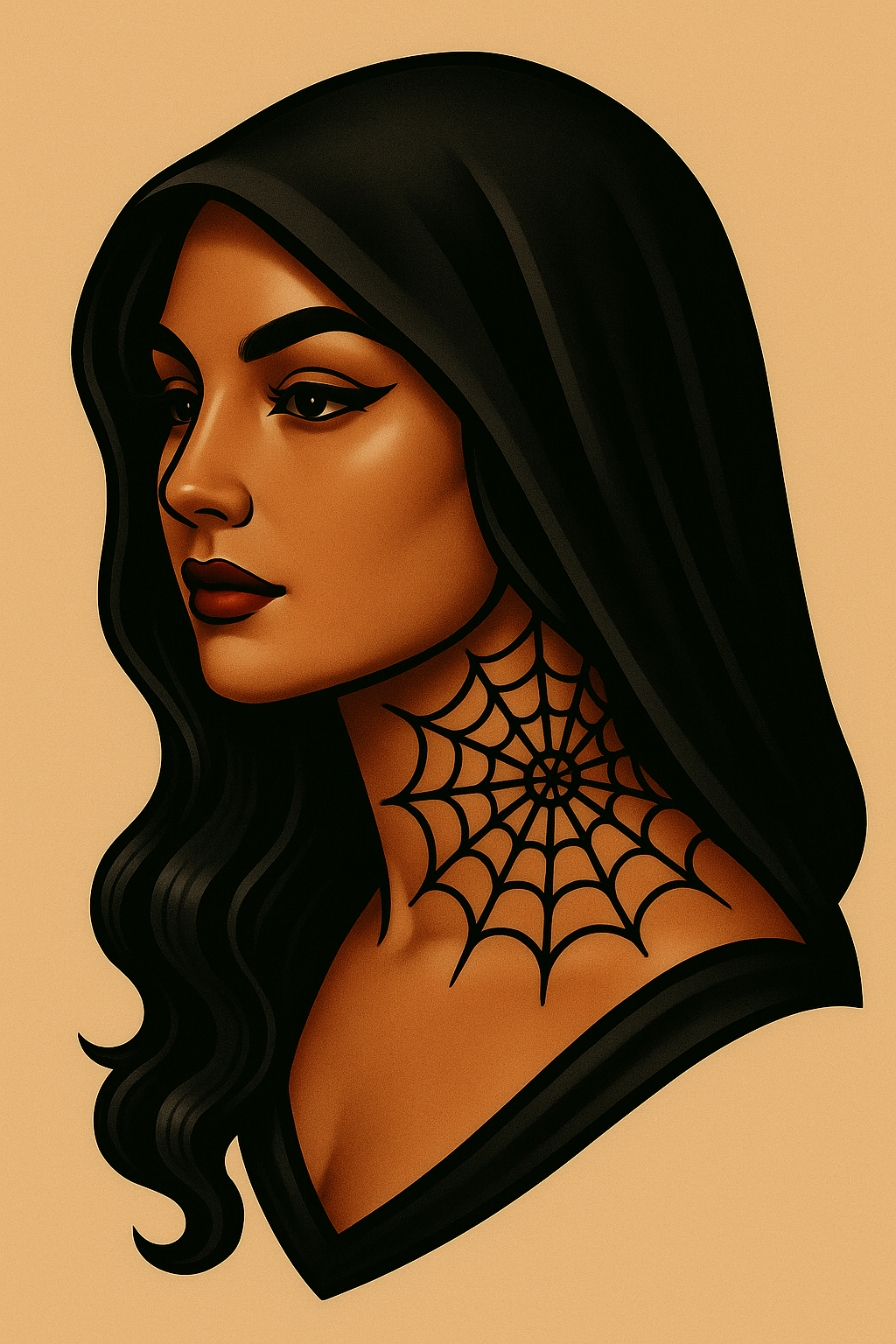 /Collection: /by davooda/Type: PNG/This image features a woman in a hooded cloak, showcasing a striking spider web tattoo on her neck. The artwork has a glossy finish and a beige background, reminiscent of classic tattoo styles.