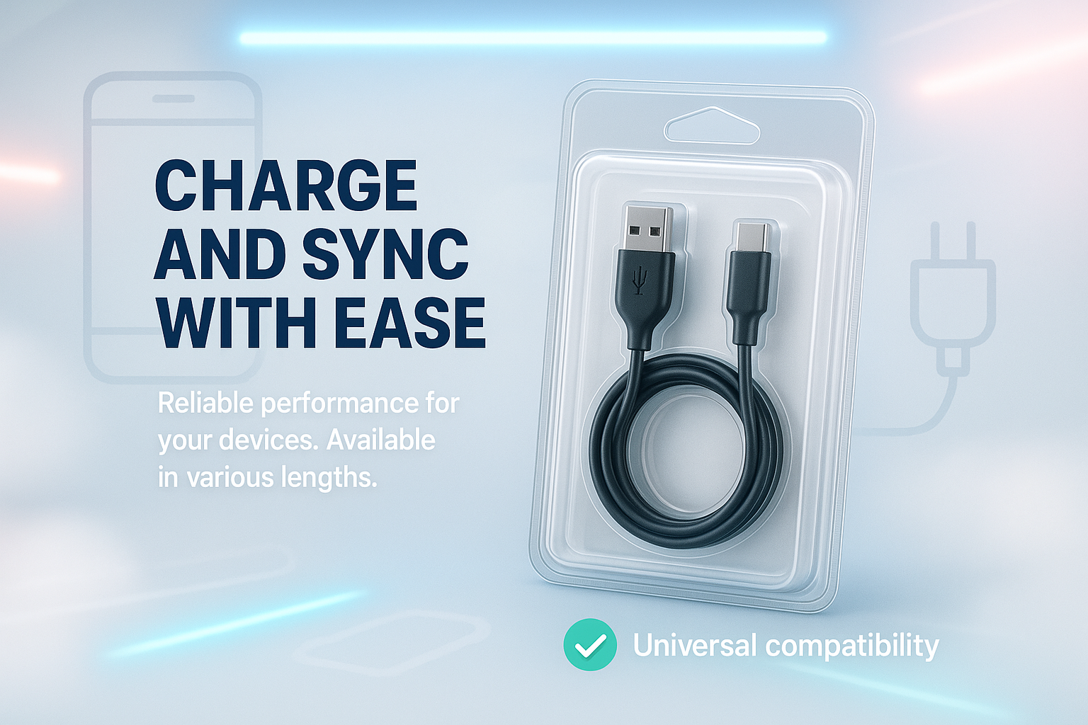 /Collection: /by davooda/Type: PNG/Modern product packaging design for a USB-C charging and syncing cable featuring a clean layout and emphasis on universal compatibility, suitable for e-commerce.