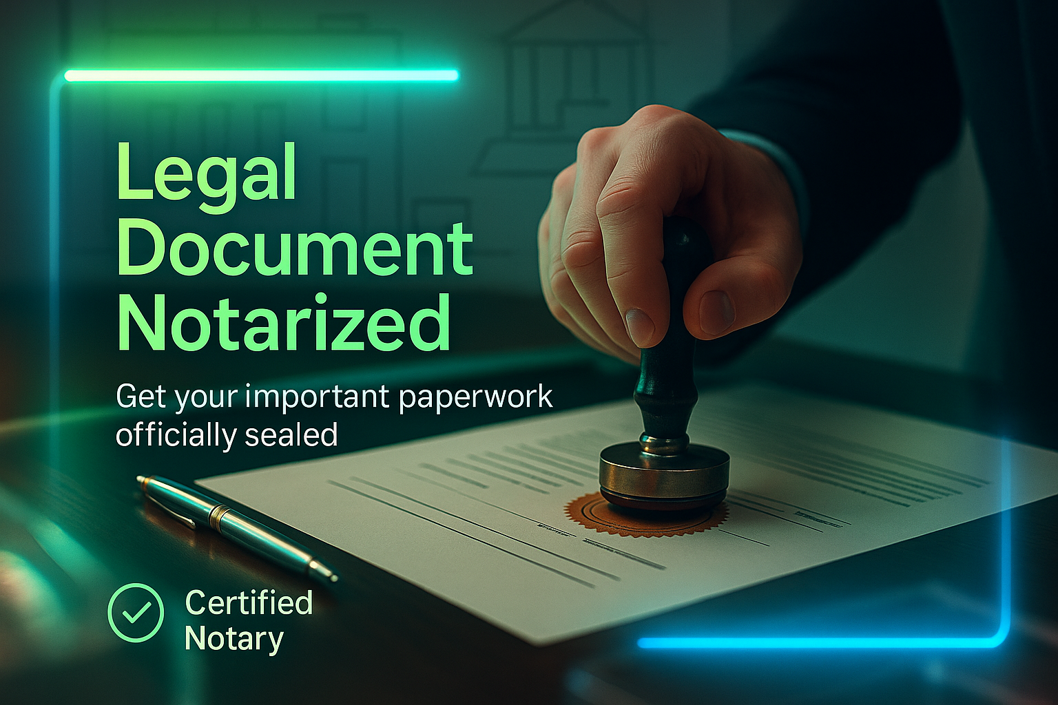 Promotional graphic showcasing a notary service with a focus on legal document notarization. The design features a hand stamping a document, appealing to individuals needing legal services.