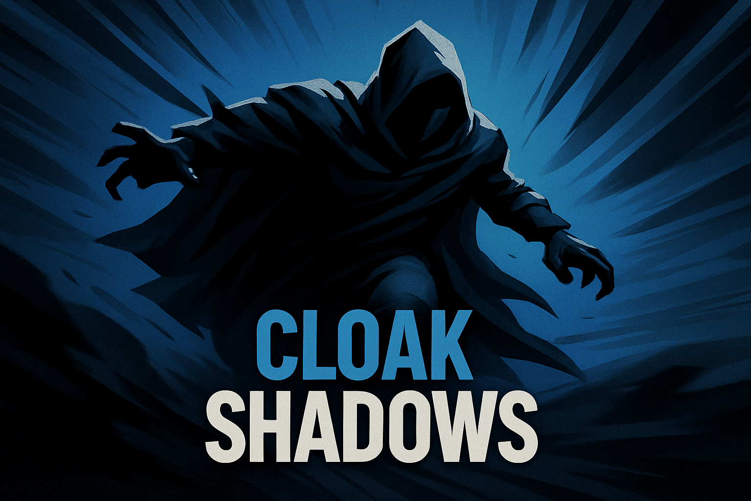 /Collection: /by davooda/Type: PNG/A striking illustration of a figure cloaked in shadows, emerging with dynamic lines radiating outward. The title 'CLOAK SHADOWS' is prominently displayed with a bold aesthetic against a smooth gradient background.
