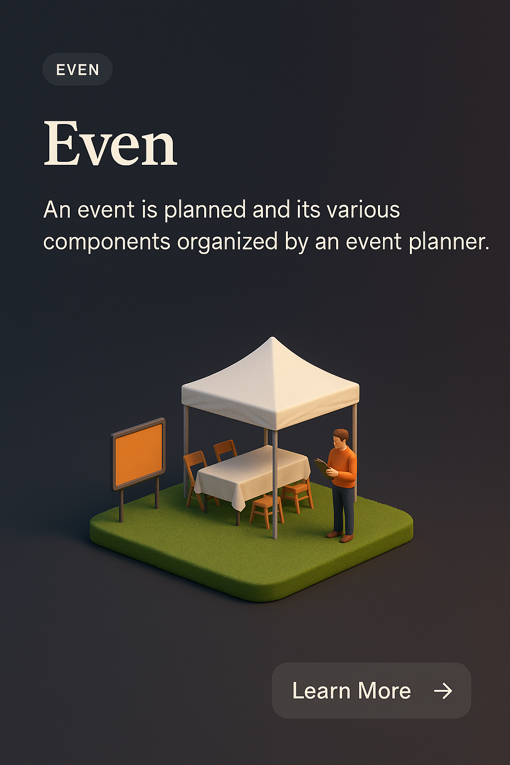 A detailed, zoomed-out 3D scene showcasing a small-scale event setup with a tent, table, and planner. The dark gradient background enhances the visual impact.