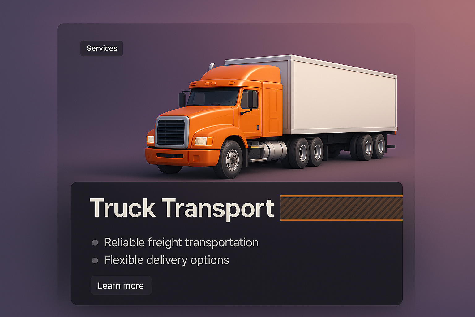 /Collection: /by davooda/Type: PNG/A sleek 3D illustration of an orange truck with a white trailer, set against a smooth gradient background. The design features a dark panel with service details and call-to-action.